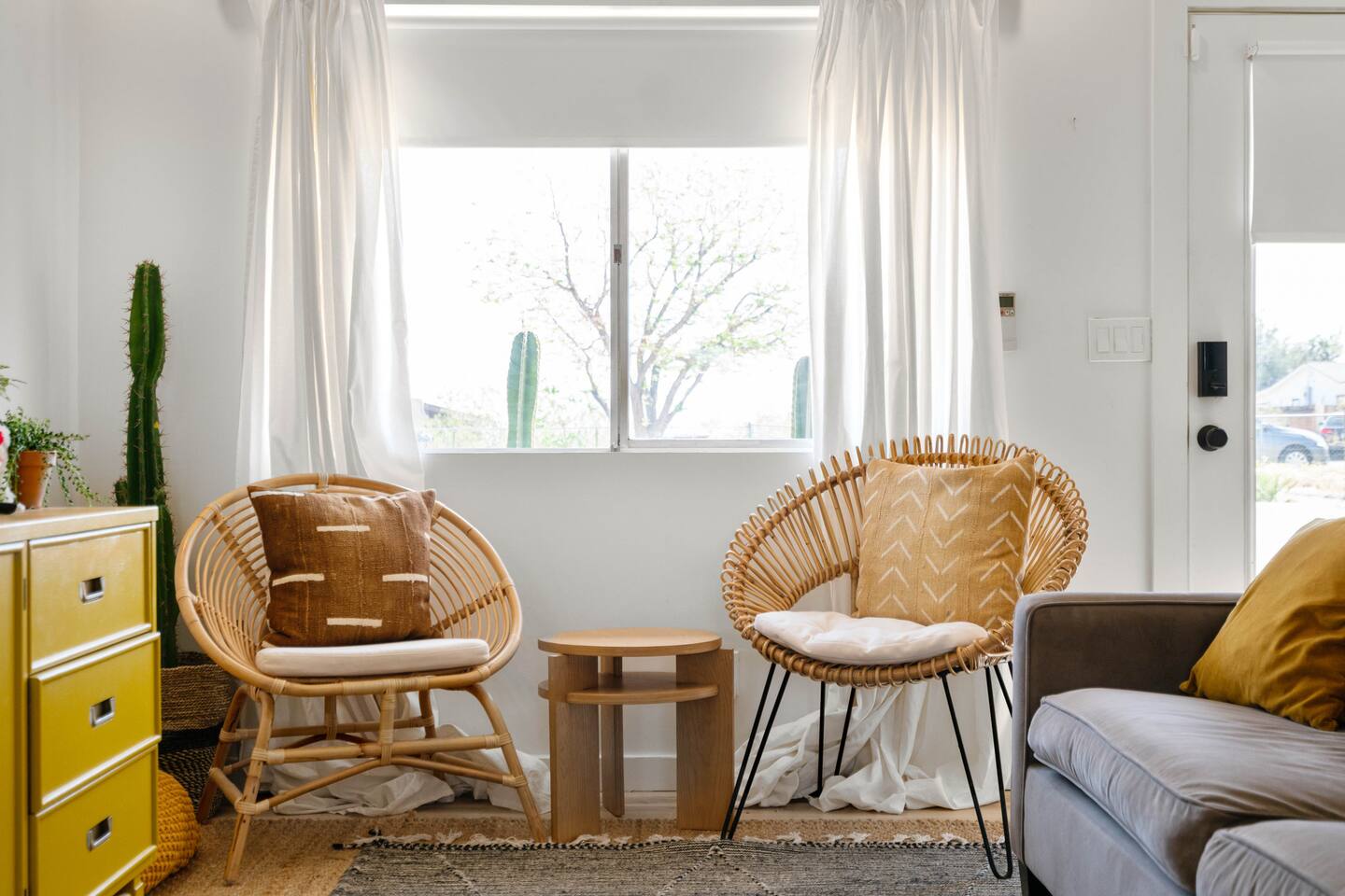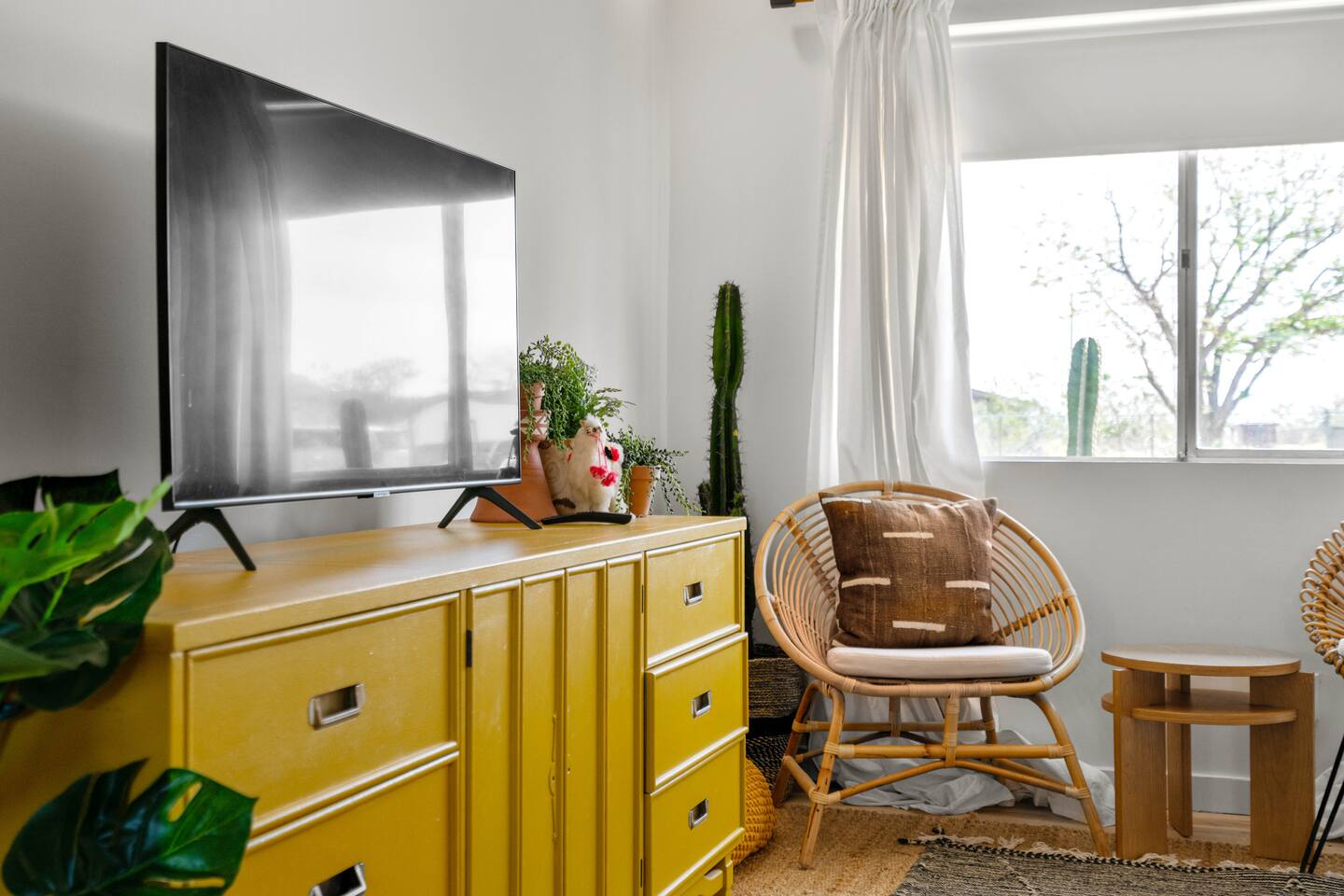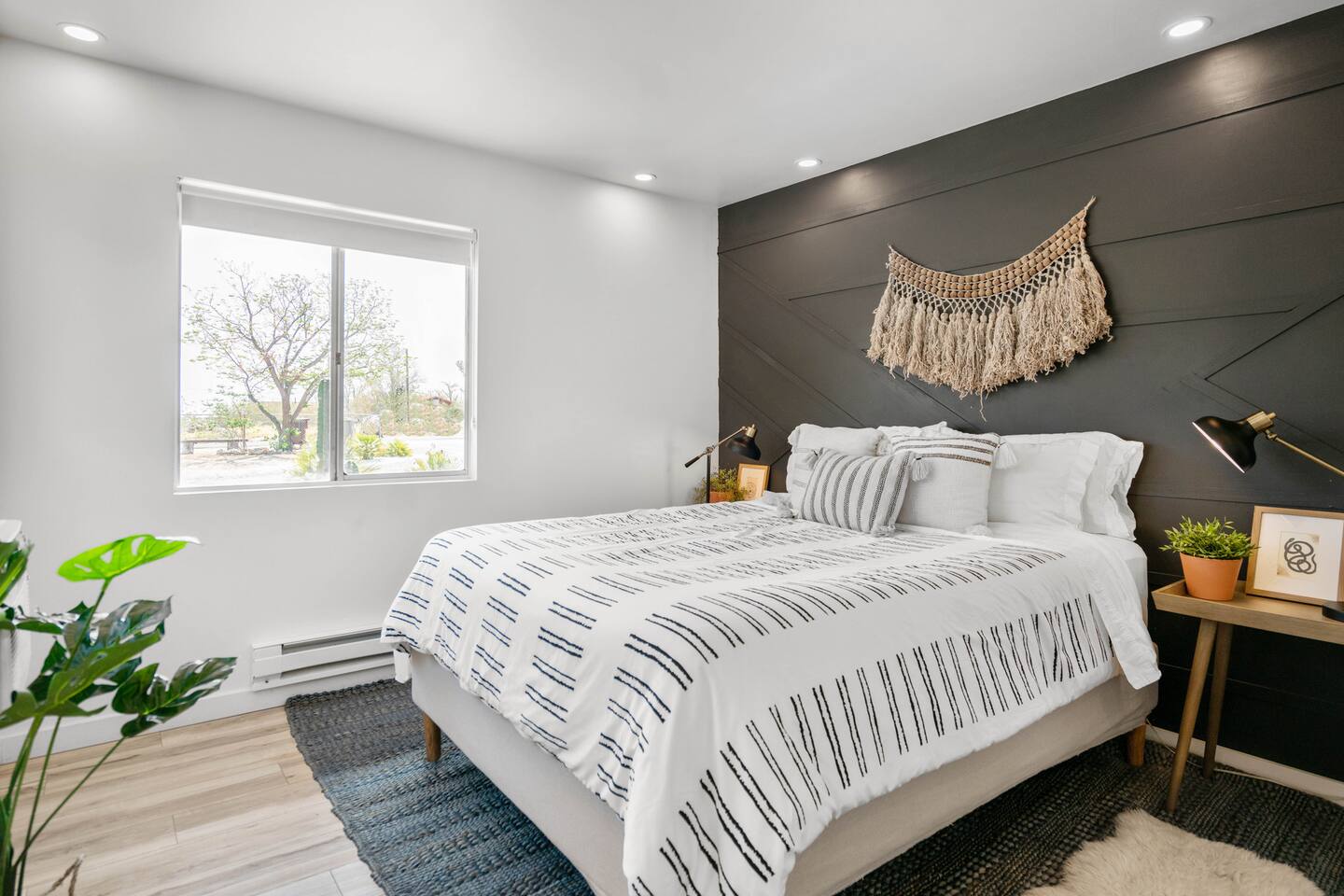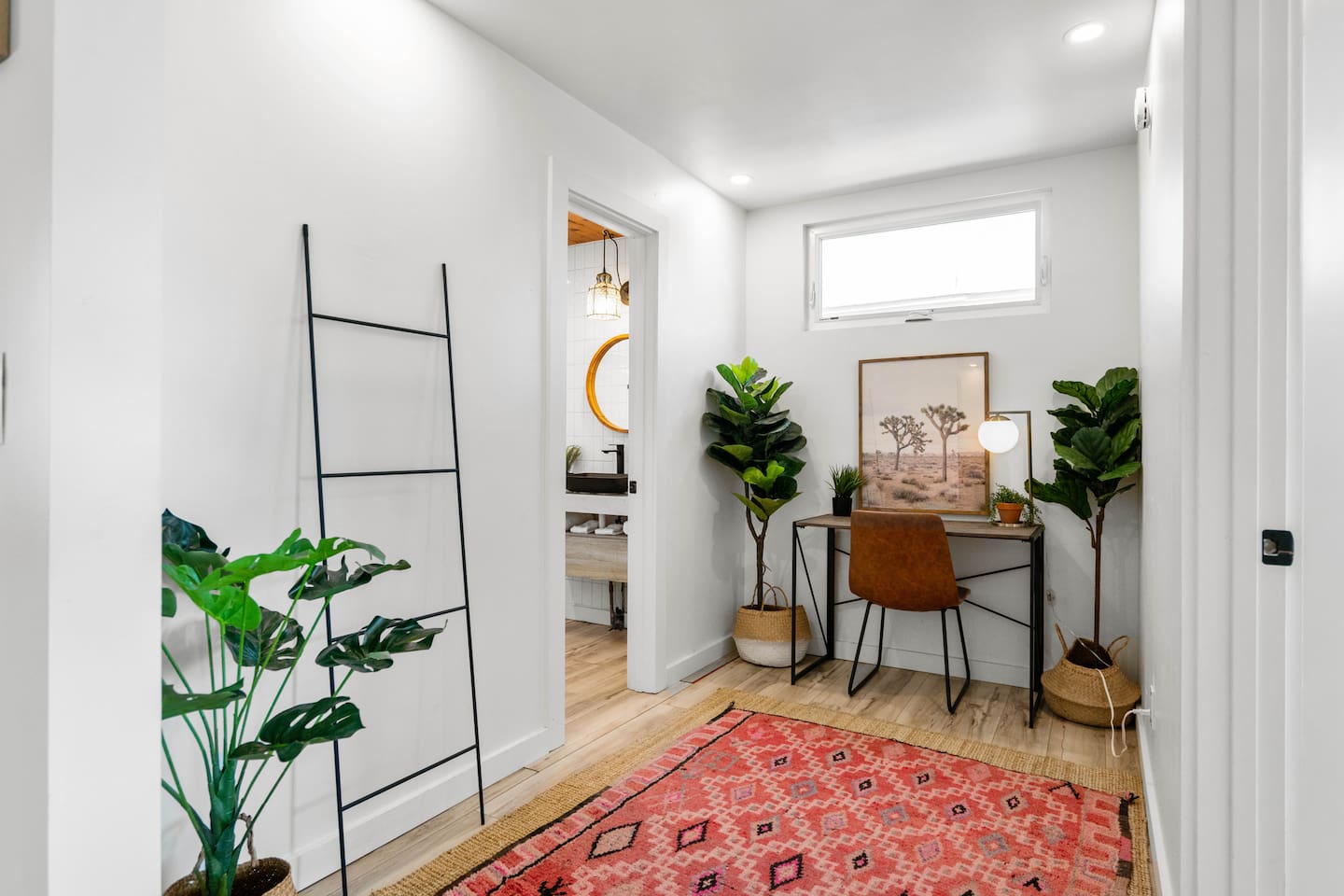 Escape to Little Cactus, a boho desert retreat just a short walk to downtown Joshua Tree. Unwind in the outdoor cowboy tub, sway in the hammock, or gather by the propane fire pit under starry skies. Inside, enjoy a full kitchen, smart TV, workspace, and bright, cozy vibes. The private fenced yard, grill, and stylish decor make this the perfect high desert hideaway. 2 min to downtown JTree, 14 min to Joshua Tree National Park.