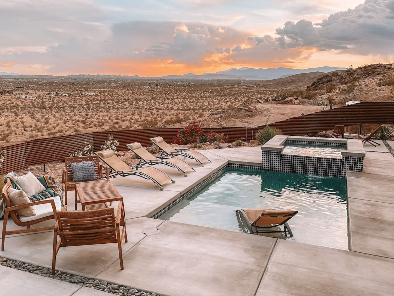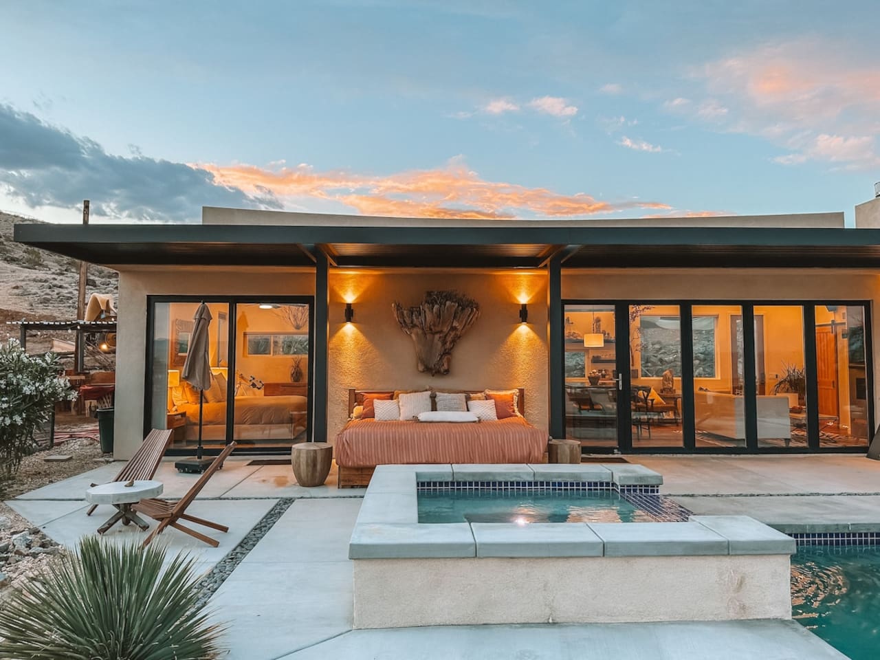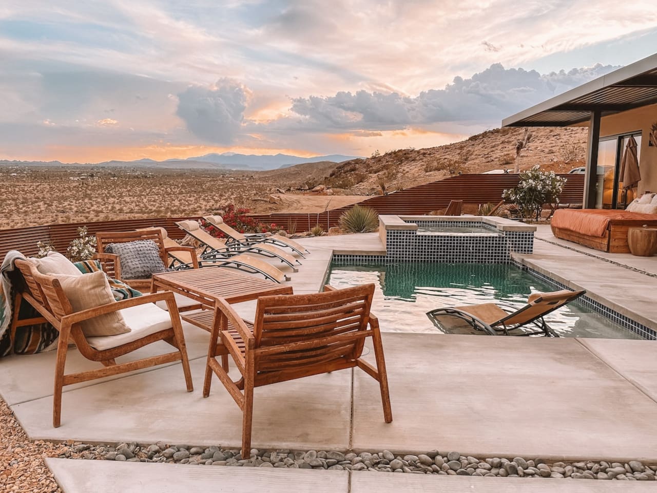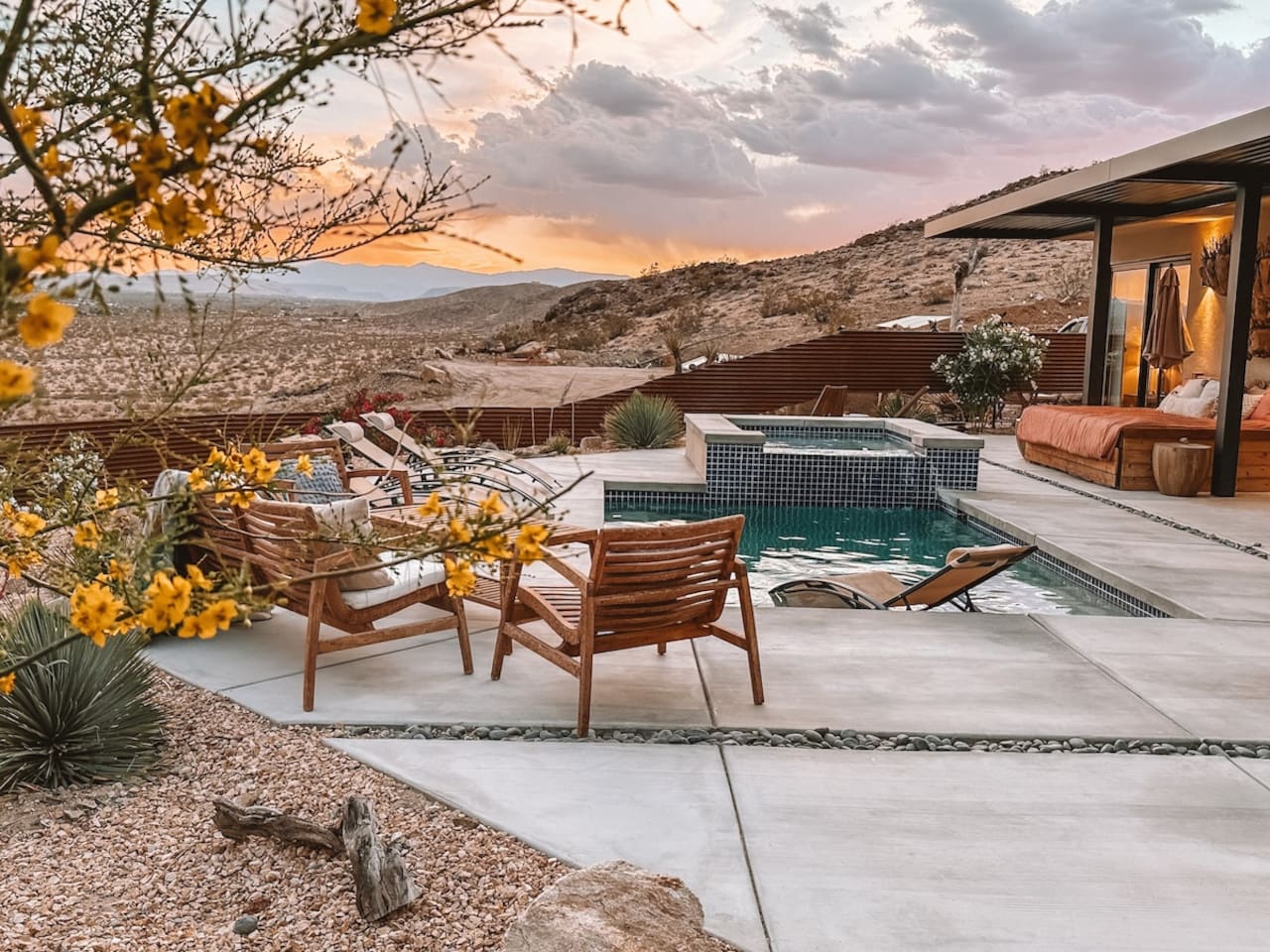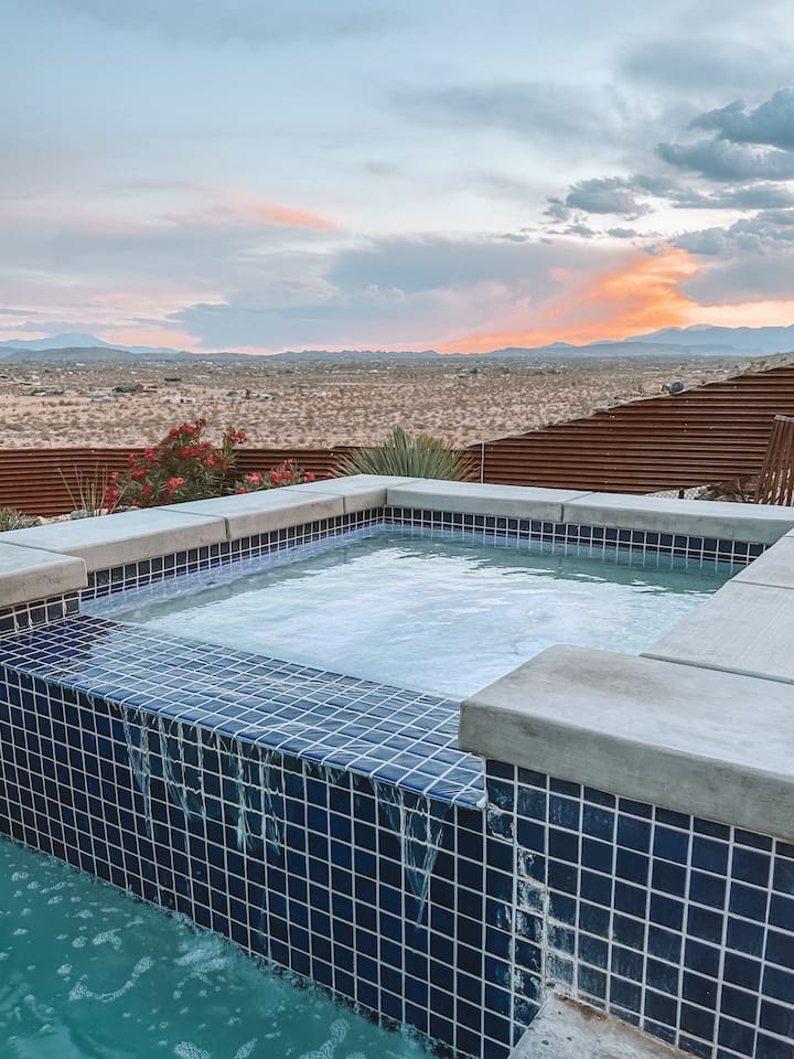 Nestled on a hilltop in the exclusive Hidden River neighborhood of Joshua Tree, this secluded sanctuary beckons you to experience the wonders of the desert. This brand-new home is on 10 private acres and features floor-to-ceiling windows that bring the beauty of the desert landscape indoors. From sunrise to sunset, bask in the awe-inspiring vistas of Joshua Tree National Park, the San Jacinto Mountains, and the iconic peak of Mount San Gorgonio, while soaking in the pool or hot tub.