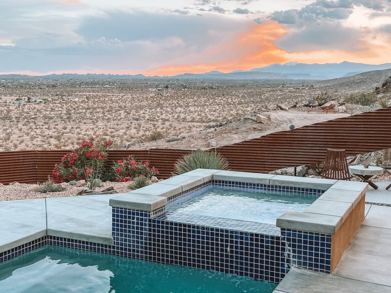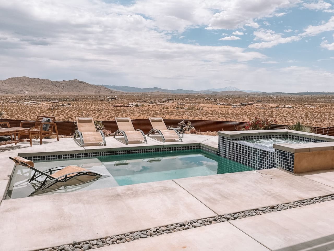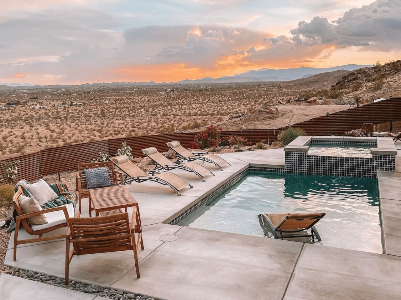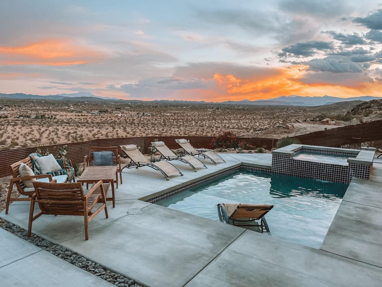 Nestled on a hilltop in the exclusive Hidden River neighborhood of Joshua Tree, this secluded sanctuary beckons you to experience the wonders of the desert. This brand-new home is on 10 private acres and features floor-to-ceiling windows that bring the beauty of the desert landscape indoors. From sunrise to sunset, bask in the awe-inspiring vistas of Joshua Tree National Park, the San Jacinto Mountains, and the iconic peak of Mount San Gorgonio, while soaking in the pool or hot tub.