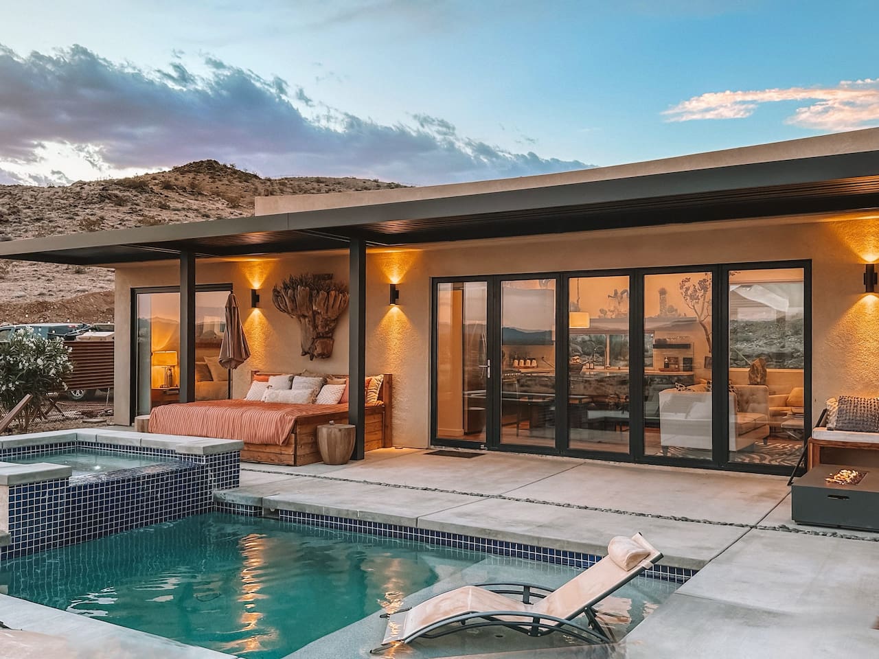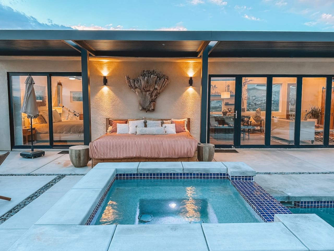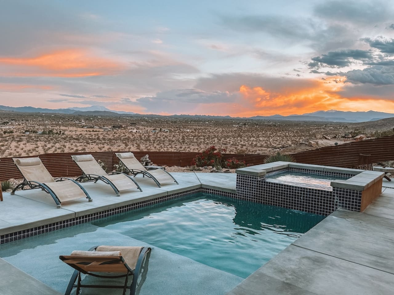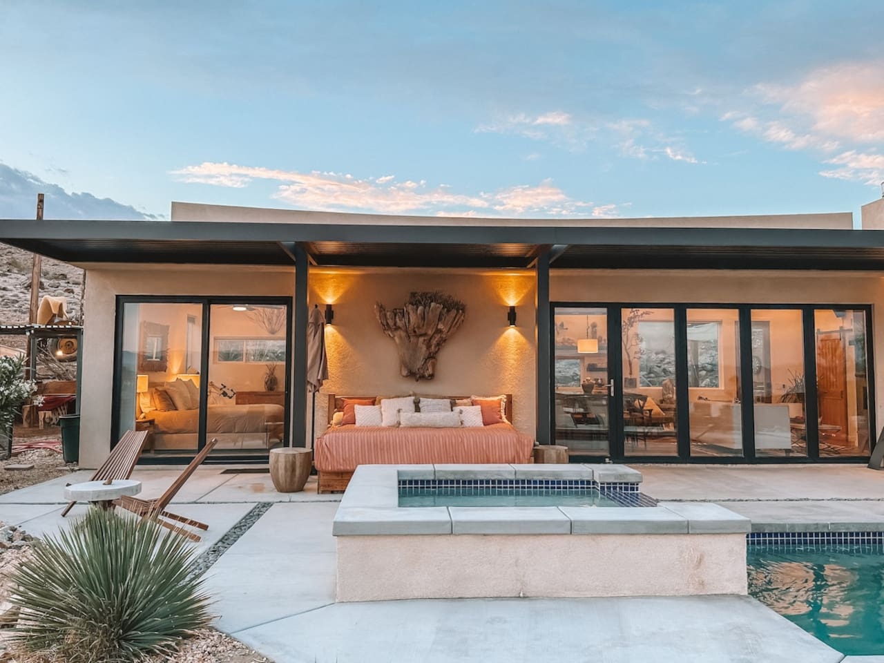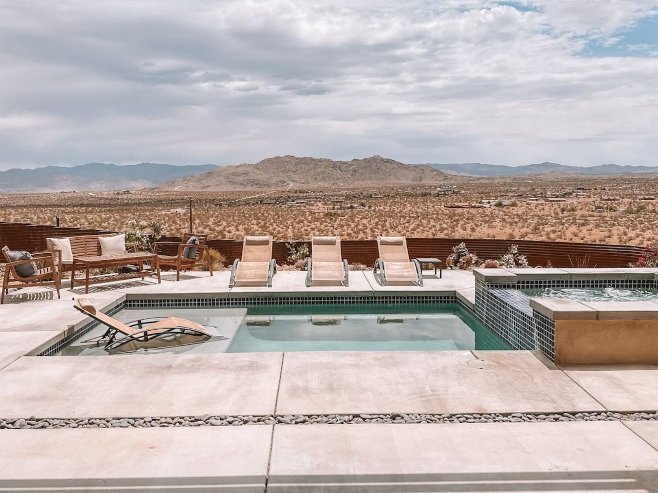 Nestled on a hilltop in the exclusive Hidden River neighborhood of Joshua Tree, this secluded sanctuary beckons you to experience the wonders of the desert. This brand-new home is on 10 private acres and features floor-to-ceiling windows that bring the beauty of the desert landscape indoors. From sunrise to sunset, bask in the awe-inspiring vistas of Joshua Tree National Park, the San Jacinto Mountains, and the iconic peak of Mount San Gorgonio, while soaking in the pool or hot tub.