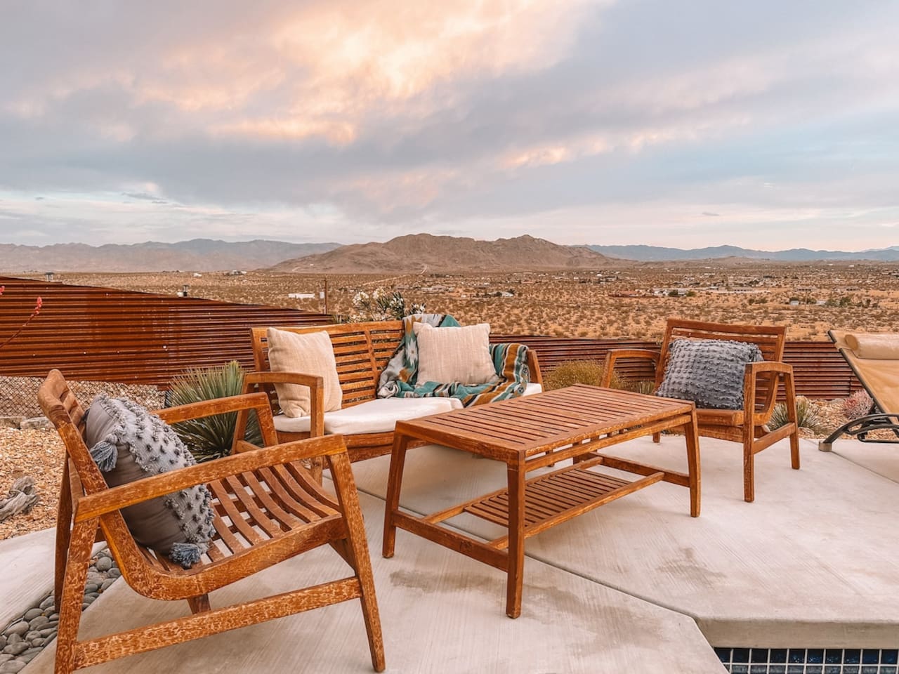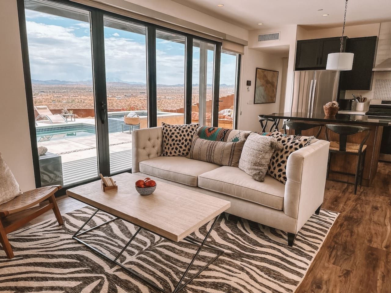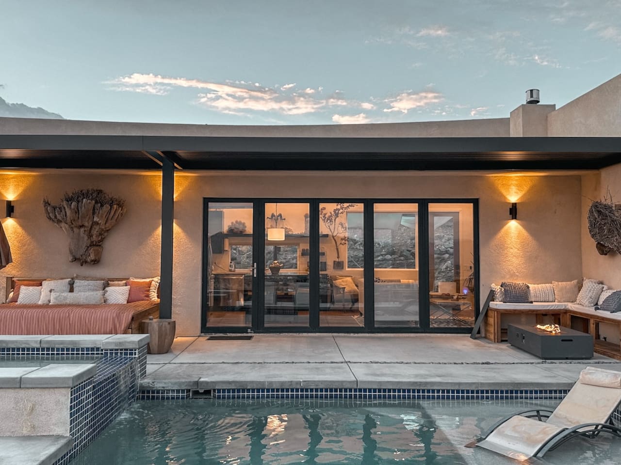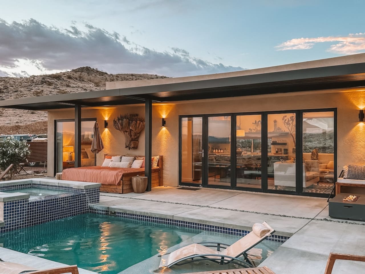 Nestled on a hilltop in the exclusive Hidden River neighborhood of Joshua Tree, this secluded sanctuary beckons you to experience the wonders of the desert. This brand-new home is on 10 private acres and features floor-to-ceiling windows that bring the beauty of the desert landscape indoors. From sunrise to sunset, bask in the awe-inspiring vistas of Joshua Tree National Park, the San Jacinto Mountains, and the iconic peak of Mount San Gorgonio, while soaking in the pool or hot tub.