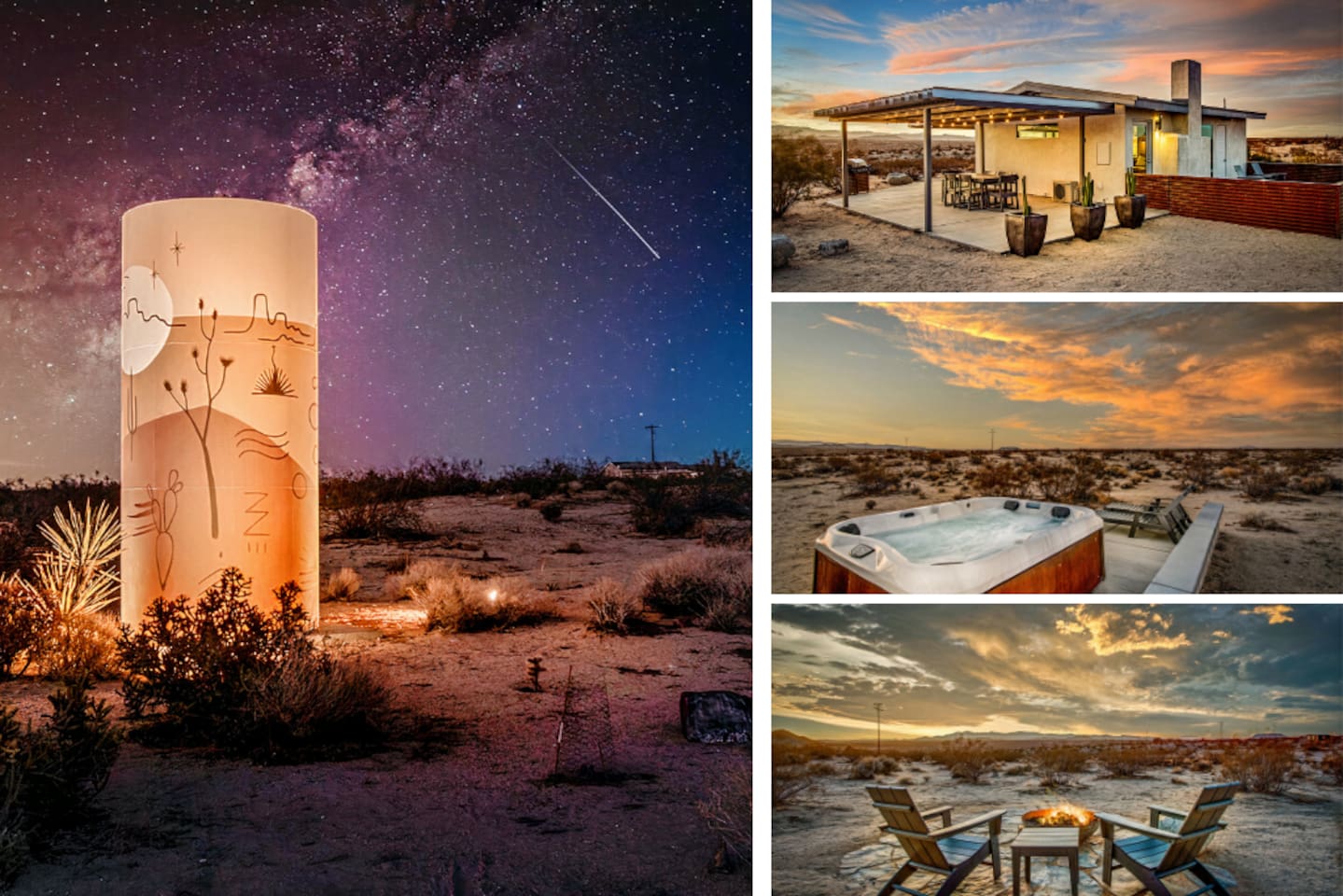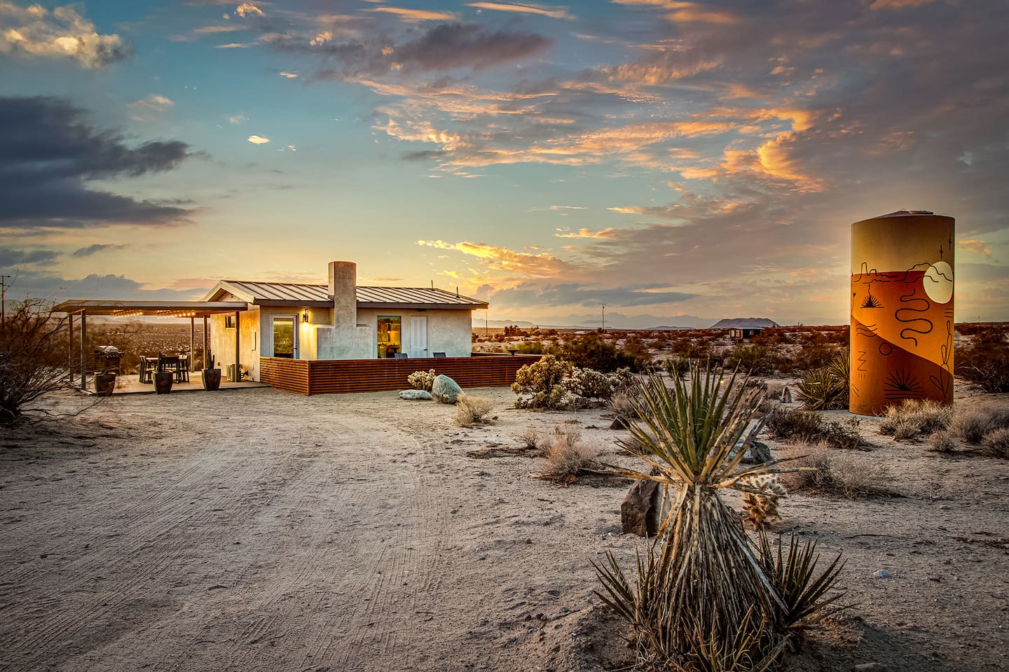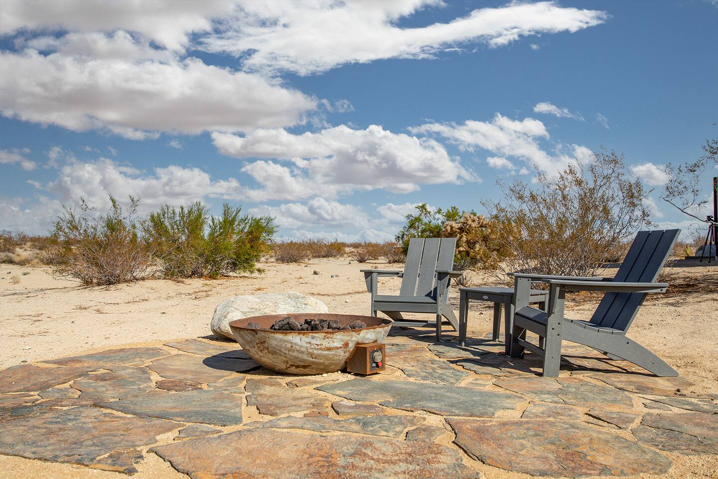At night, soft path lighting guides you between cozy gathering spots. Toss on a robe, grab a glass of wine, and let the magic of Joshua Tree wrap around you.