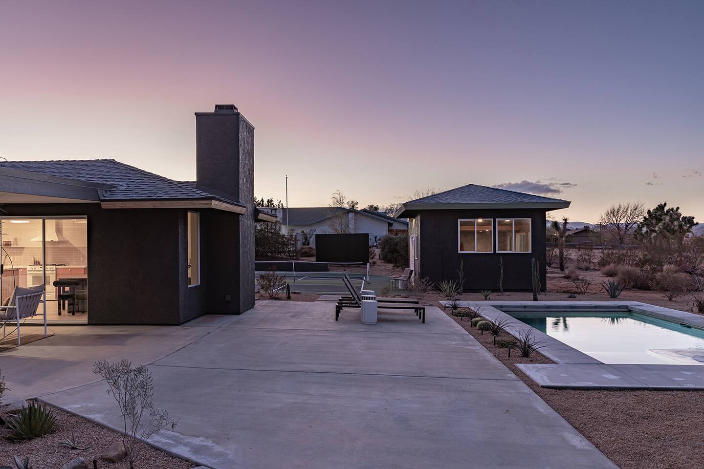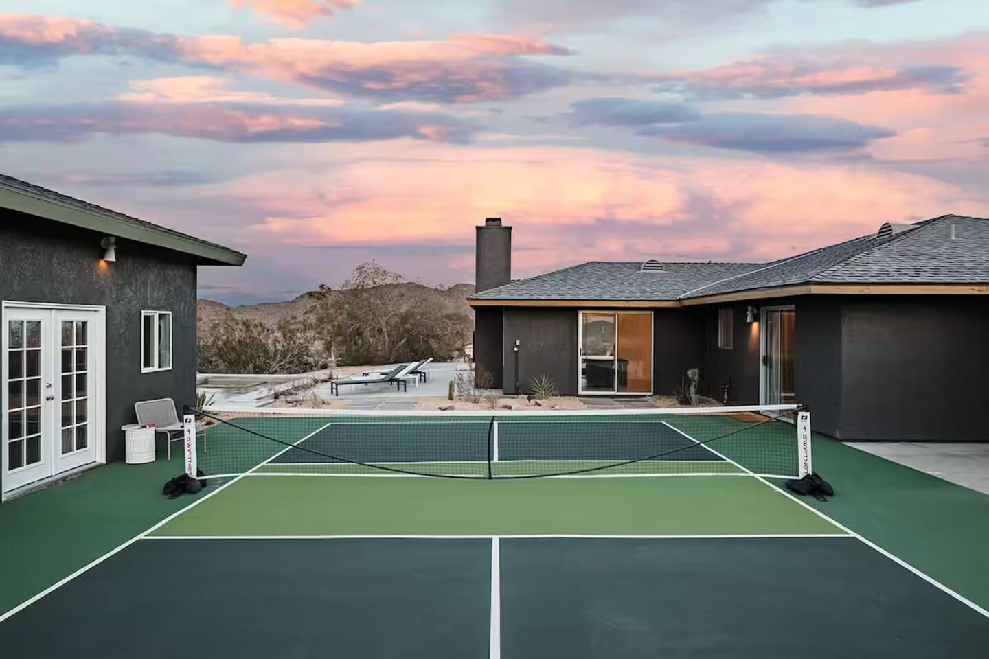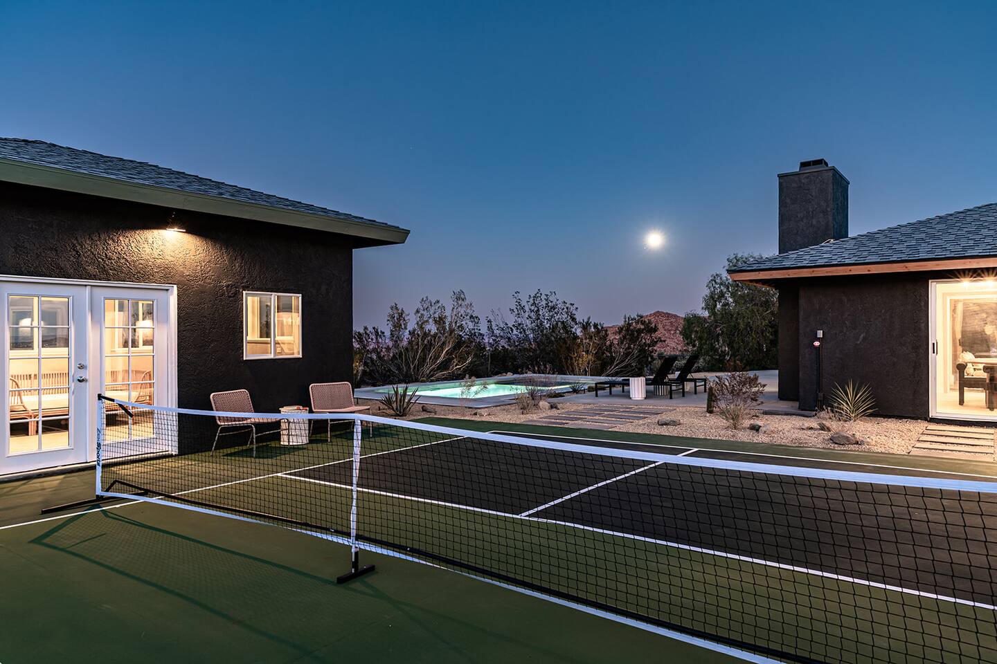 Escape to the desert at Mojave Paddle Club. This refined playground features a pool that can be heated year round, an in ground spa, a game room with pool/ping pong table and a pickleball court. Nestled above the hills of Joshua Tree village, live outdoors with a gas firepit under the stars and al fresco dining. This recently remodeled home blends modern art deco design seamlessly with sparse desert serenity. Centrally located, this is the perfect jumping off point for your hi desert adventures.