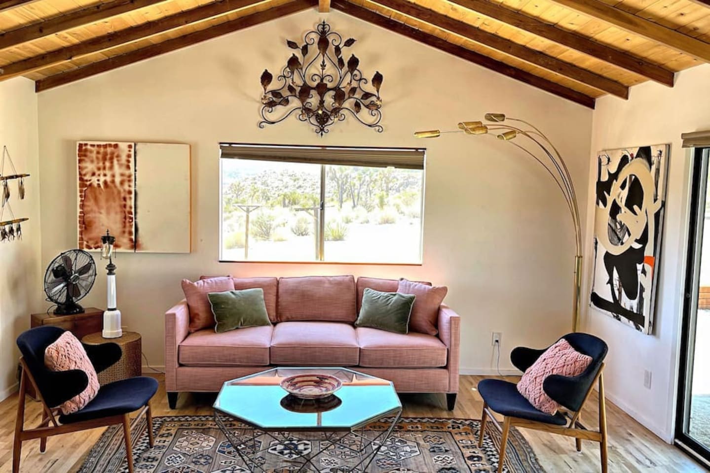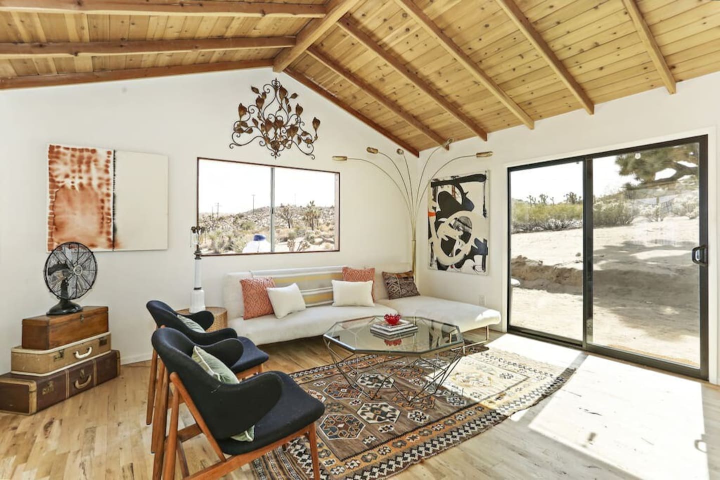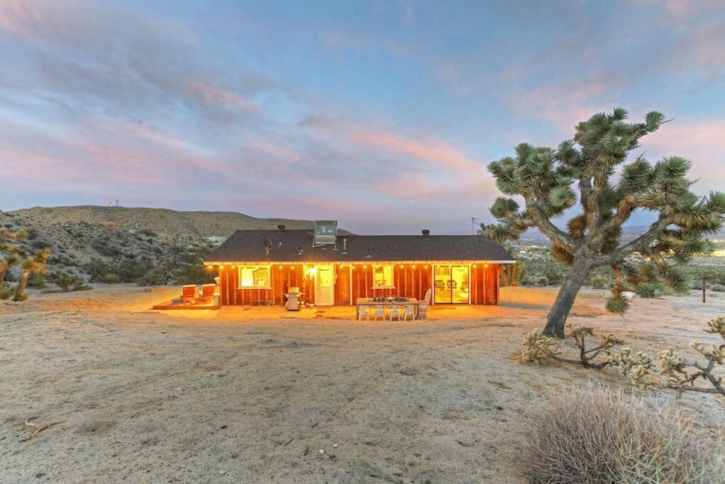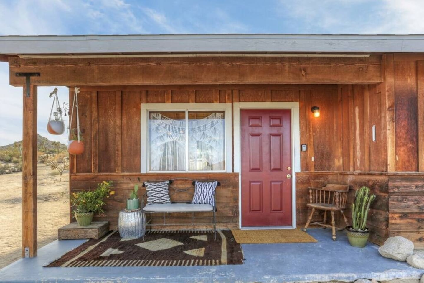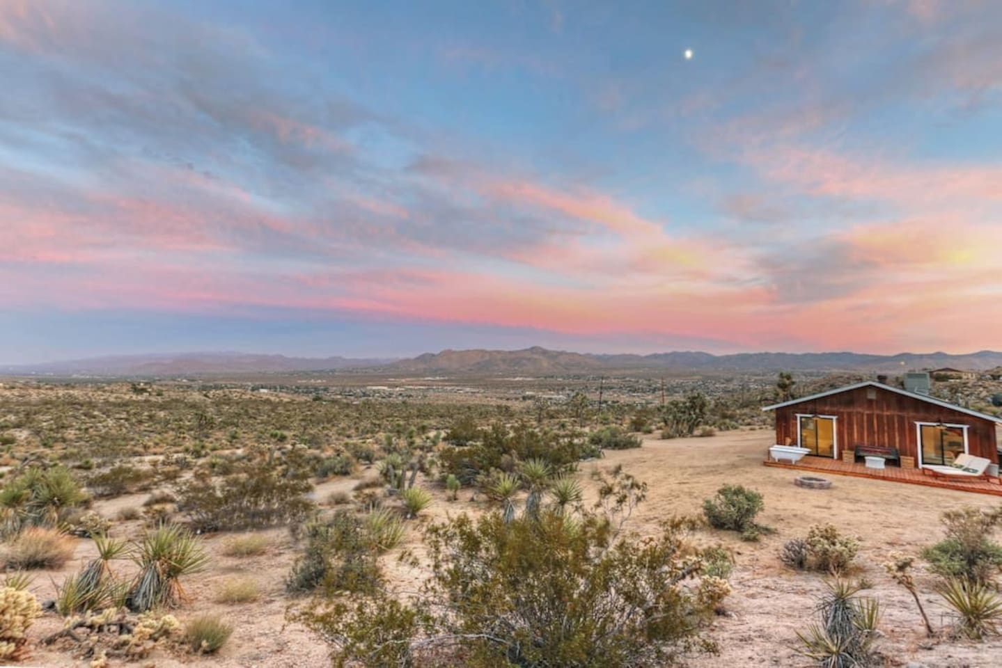 Discover La Luna Cabin, a vintage-chic 2BR desert retreat on 5 wild acres near Joshua Tree National Park. Soak under starry skies in the outdoor clawfoot bath, unwind on the porch with endless desert views, and enjoy retro-modern charm inside. Fully stocked kitchen, outdoor dining, washer/dryer, and vibrant art nearby. Just 5 min to Yucca shops, 10 min to Downtown Joshua Tree, and 15 minutes to the National Park. Wild beauty and cozy comforts await!