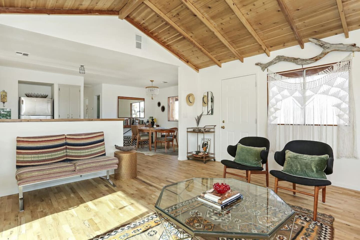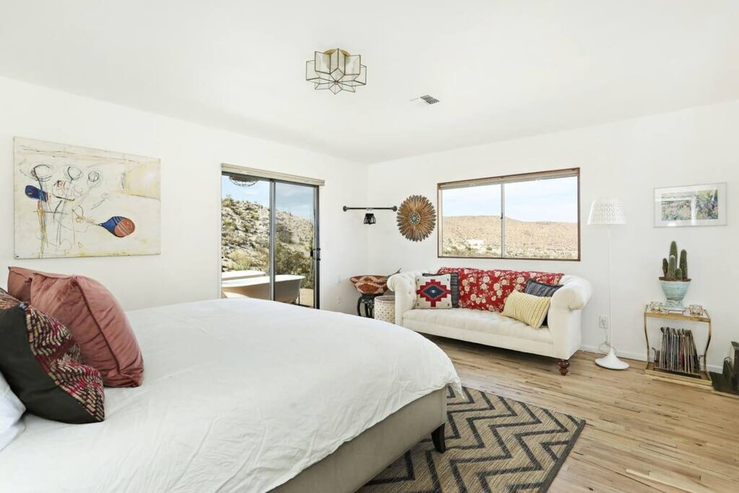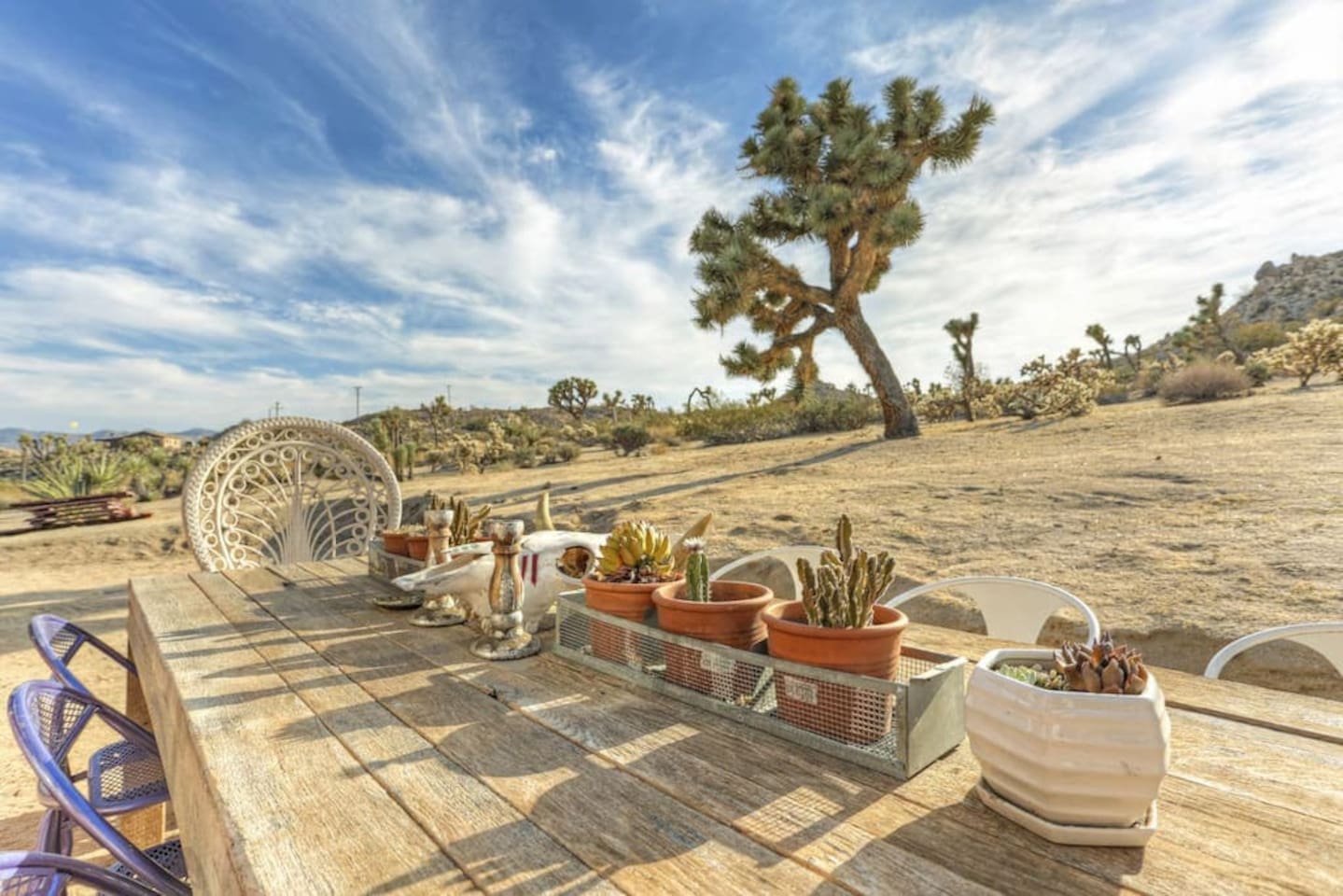 Guests at La Luna Cabin will have full access to the entire property, ensuring a private and exclusive experience. You'll have the freedom to explore every corner of this enchanting retreat, from the cozy interiors to the captivating outdoor spaces. Inside the cabin, you'll find two beautifully appointed bedrooms, providing comfortable sleeping arrangements for a restful night's sleep. The vintage fixtures and unique art throughout the space create an ambiance that is both charming and inspiring. Indulge in the luxury of our two porcelain clawfoot tubs, allowing you to soak away your cares in style. The fully stocked kitchen awaits your culinary adventures, complete with all the necessary appliances, cookware, and utensils. Whether you're preparing a leisurely breakfast or a gourmet feast, you'll find everything you need to satisfy your culinary desires. Step outside and be greeted by the boundless beauty of the desert. The outdoor area is yours to enjoy, with never-ending views that stretch across the horizon. Relax in the outdoor dining area, where you can savor meals under the open sky, surrounded by the tranquility of the natural surroundings. For added convenience, laundry facilities are available on-site. Feel free to utilize the washer and dryer during your stay, allowing you to pack light and maintain fresh clothes throughout your desert adventures. As a guest at La Luna Cabin, you'll have the space and freedom to fully immerse yourself in the unique experience of the Joshua Tree area. Explore the vast landscapes, encounter fascinating wildlife, and discover the hidden treasures of the desert at your own pace. Get ready to embark on an unforgettable journey where vintage charm, natural beauty, and artistic inspiration converge. La Luna Cabin invites you to unlock the door to a world of enchantment and create memories that will last a lifetime.