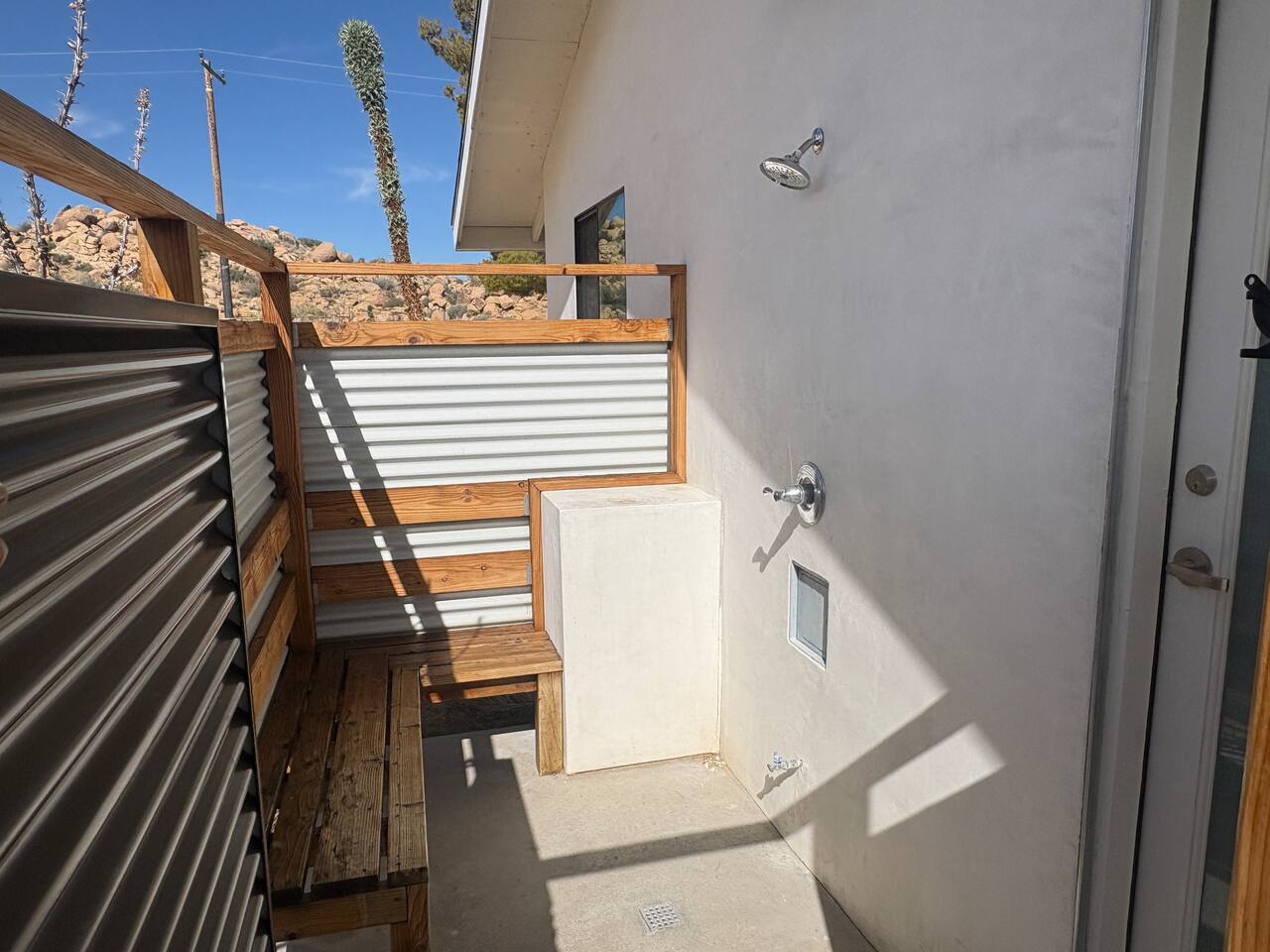 There are two bedrooms: one with a king bed and one with a queen. The bathroom is indoor/outdoor with a separate outdoor shower accessible through the main bathroom.