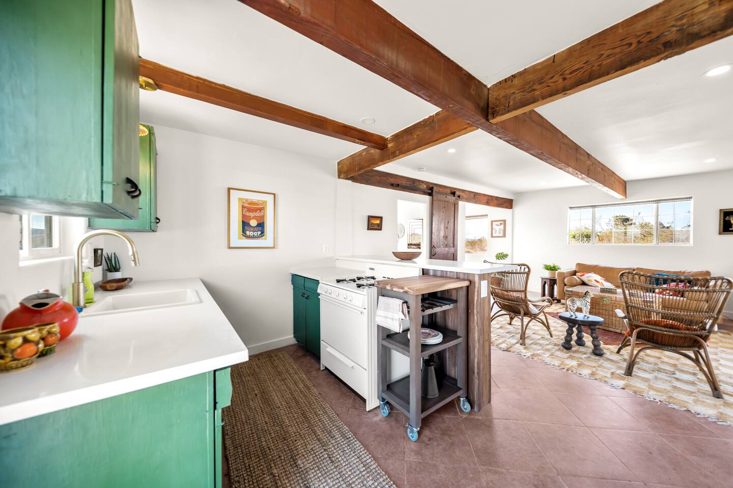 The kitchen is stocked with pots/pans/dishes/silverware and has a gas stove for cooking. There's a pull down projector screen over the breakfast bar for streaming movies and high speed satellite internet for working.