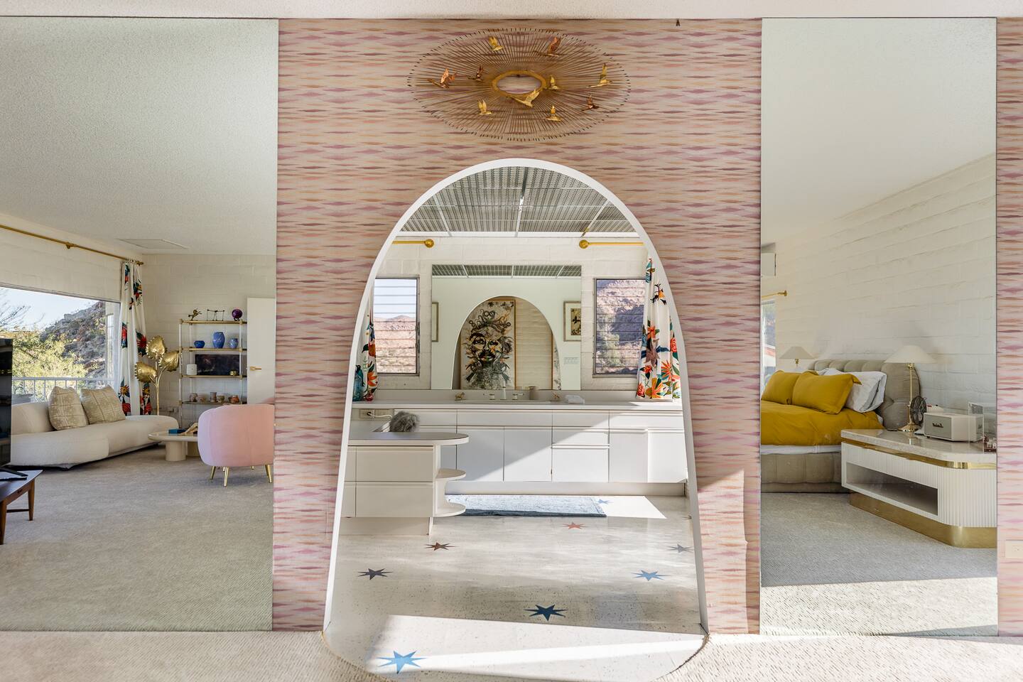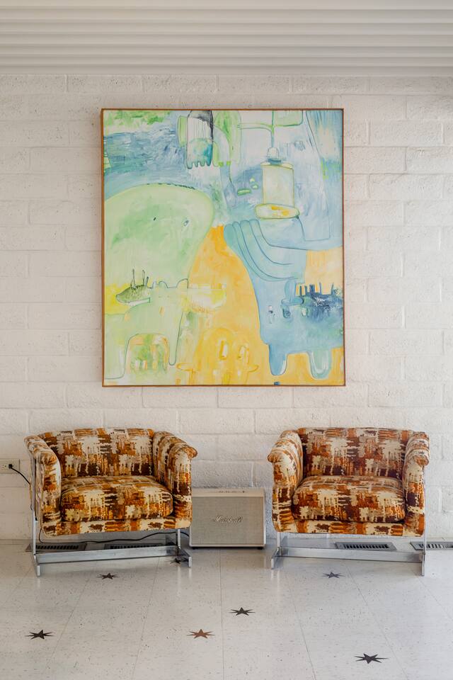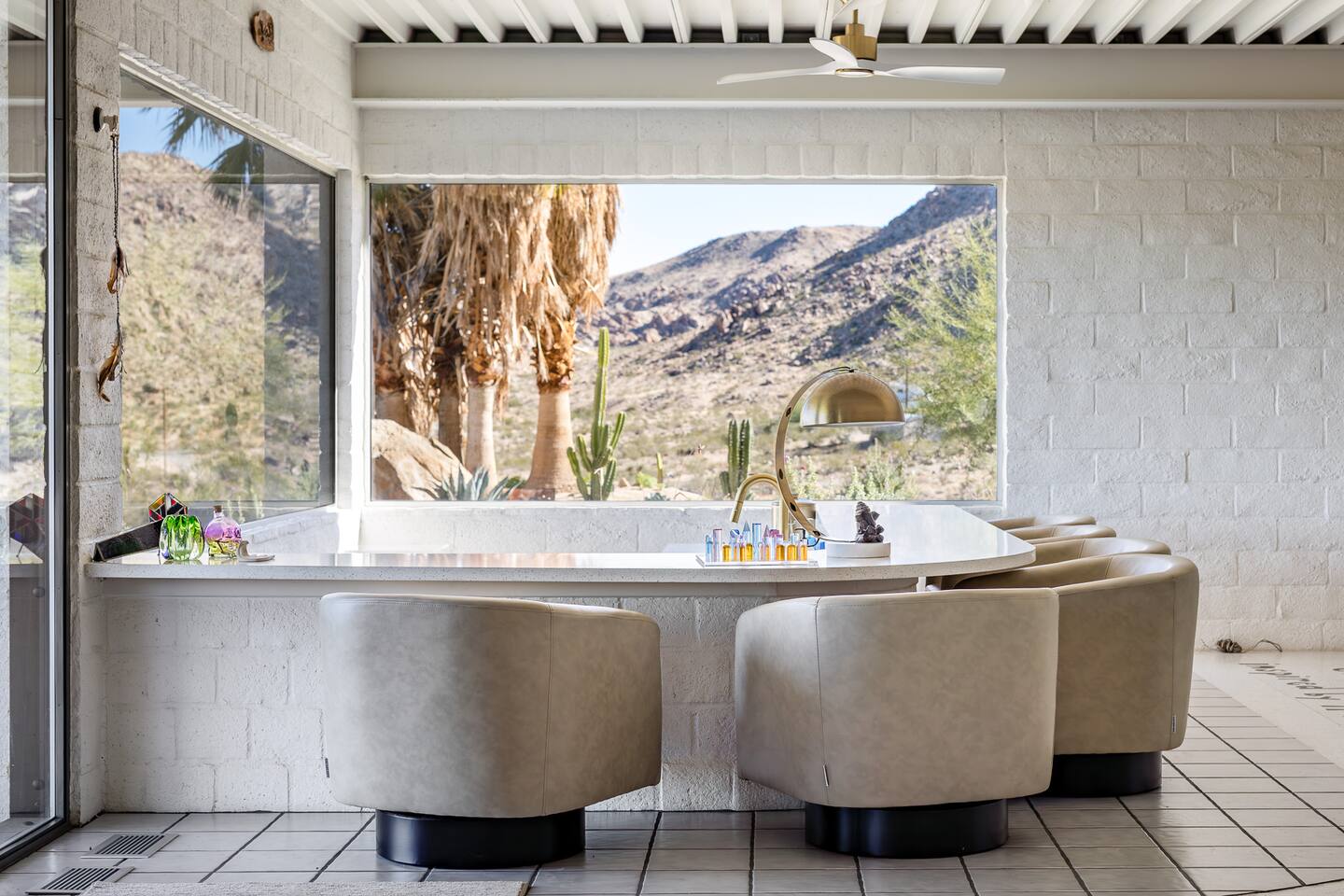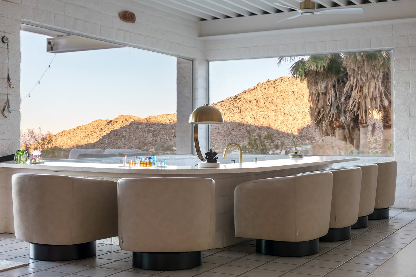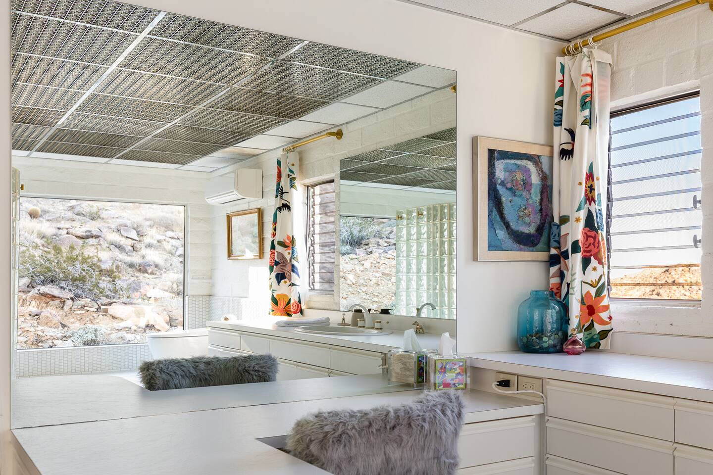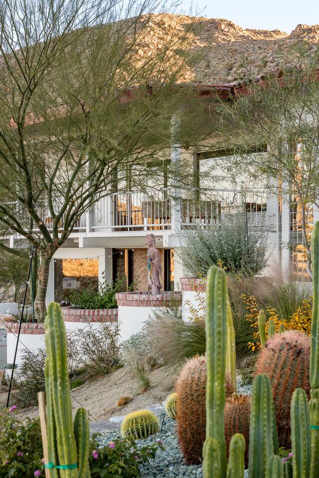 Nestled against the rocks in 29 Palms, Zainaland is a stunning, 3 bedroom, 3.5 bathroom unique estate. Live outdoors with sweeping views, a hot tub, wood burning firepit and outdoor dining space. Inside, relive Joshua Tree in the 70's with this captivating home full of original details and eclectic decor. Cozy up to the bar in the gigantic living room and toast to the desert in this wildly exotic, but elegant home.