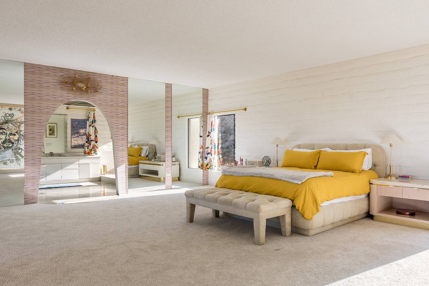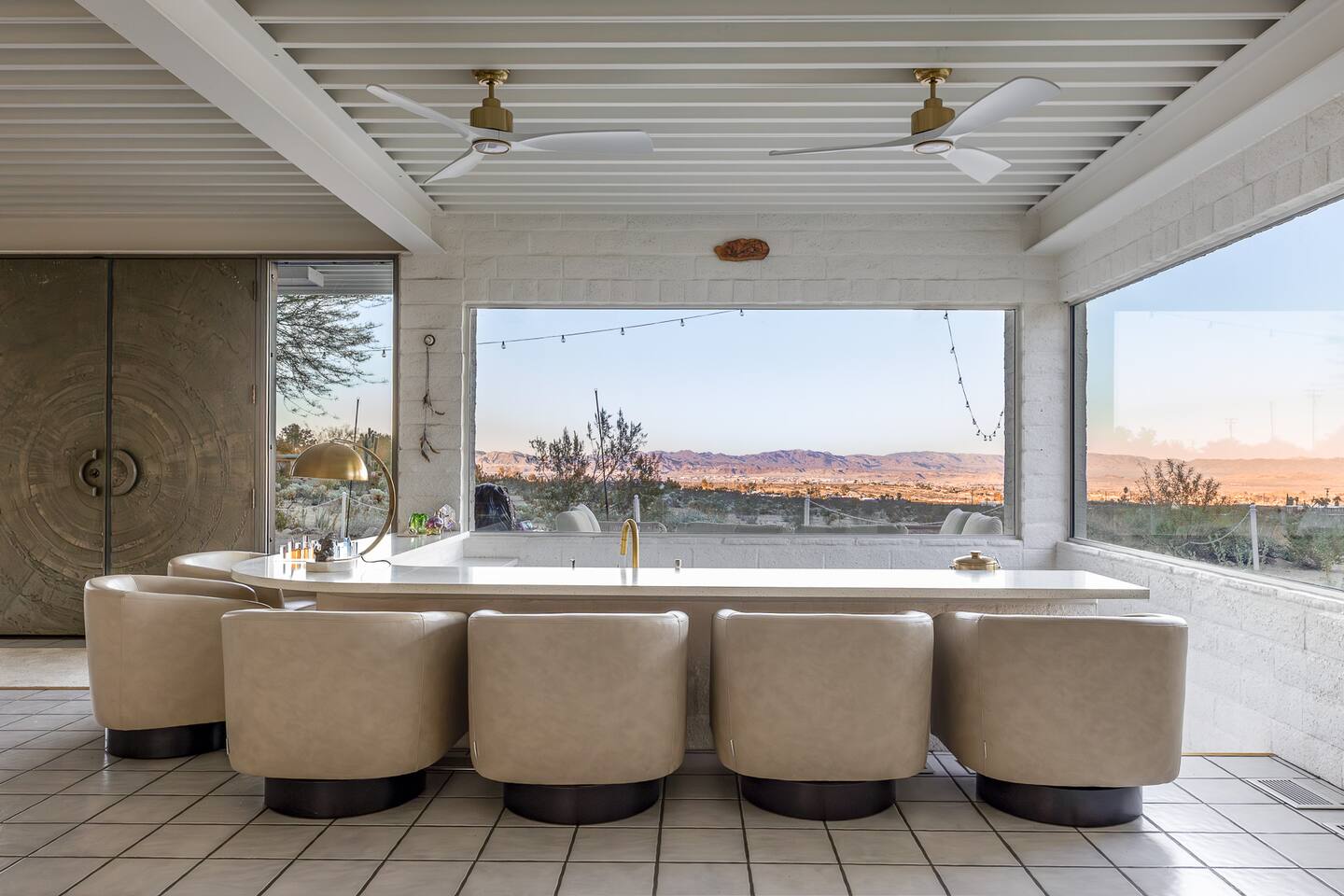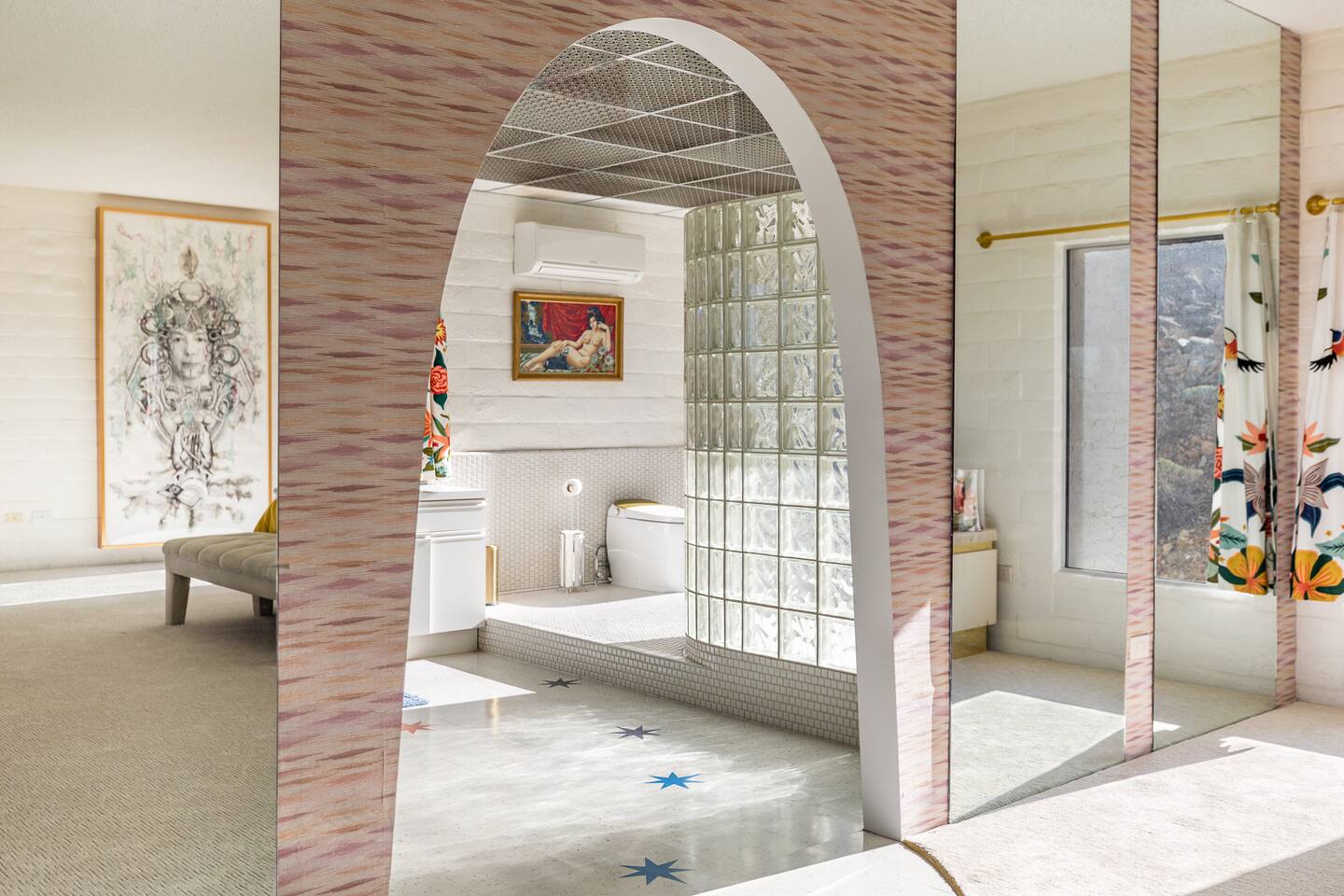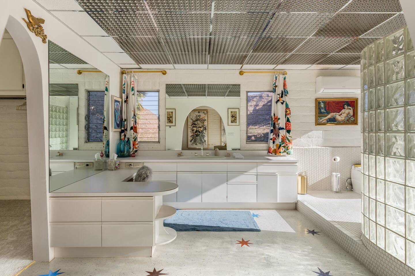 Nestled against the rocks in 29 Palms, Zainaland is a stunning, 3 bedroom, 3.5 bathroom unique estate. Live outdoors with sweeping views, a hot tub, wood burning firepit and outdoor dining space. Inside, relive Joshua Tree in the 70's with this captivating home full of original details and eclectic decor. Cozy up to the bar in the gigantic living room and toast to the desert in this wildly exotic, but elegant home.