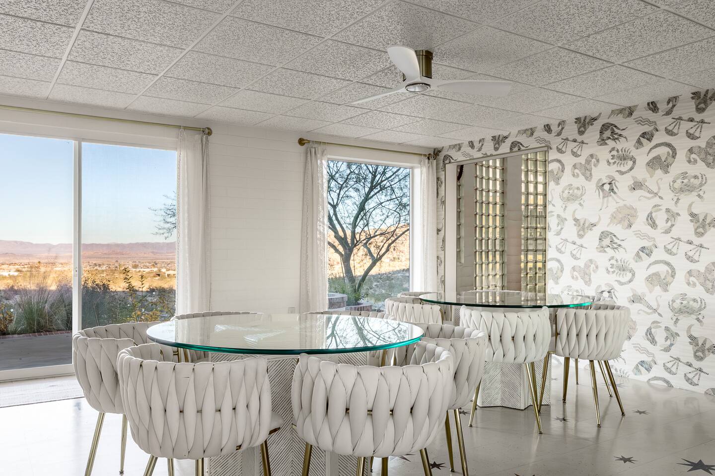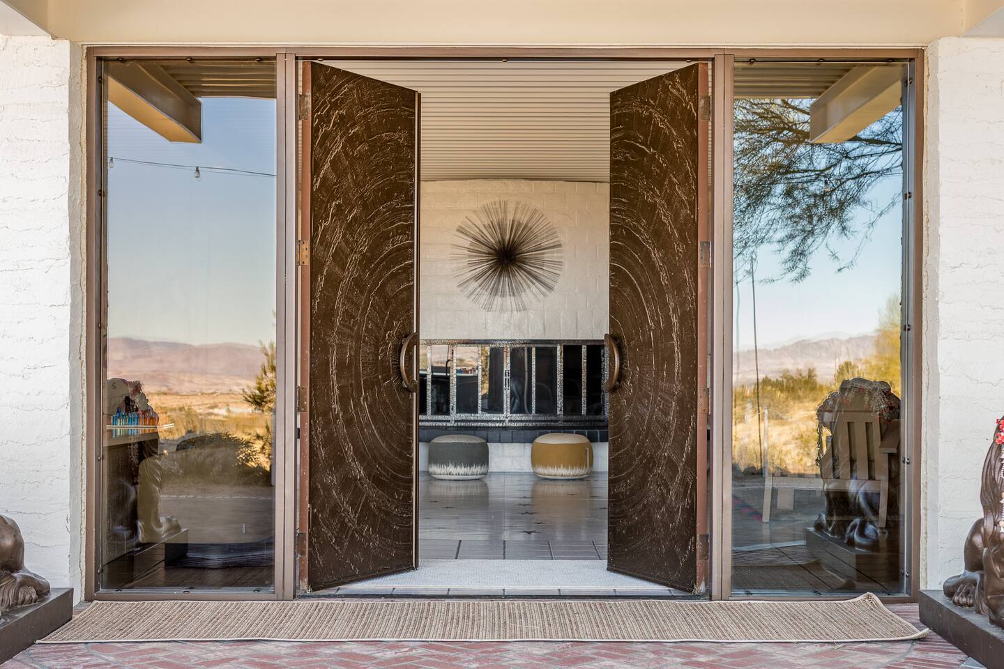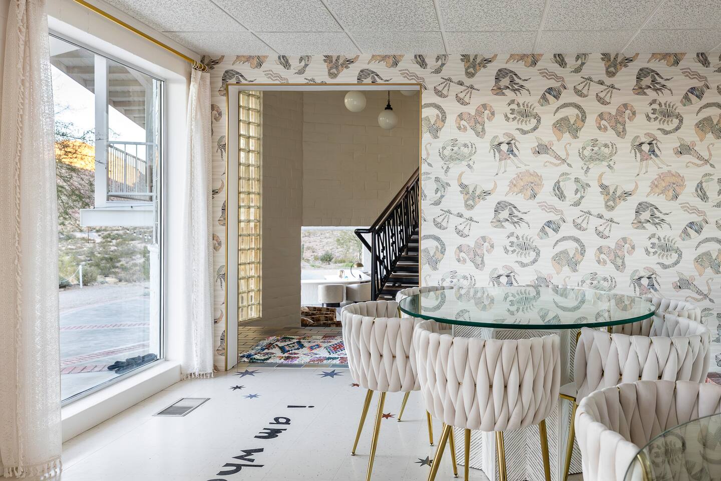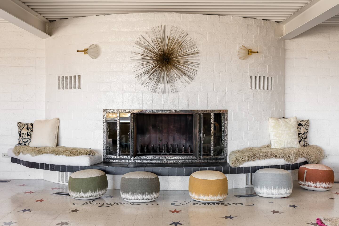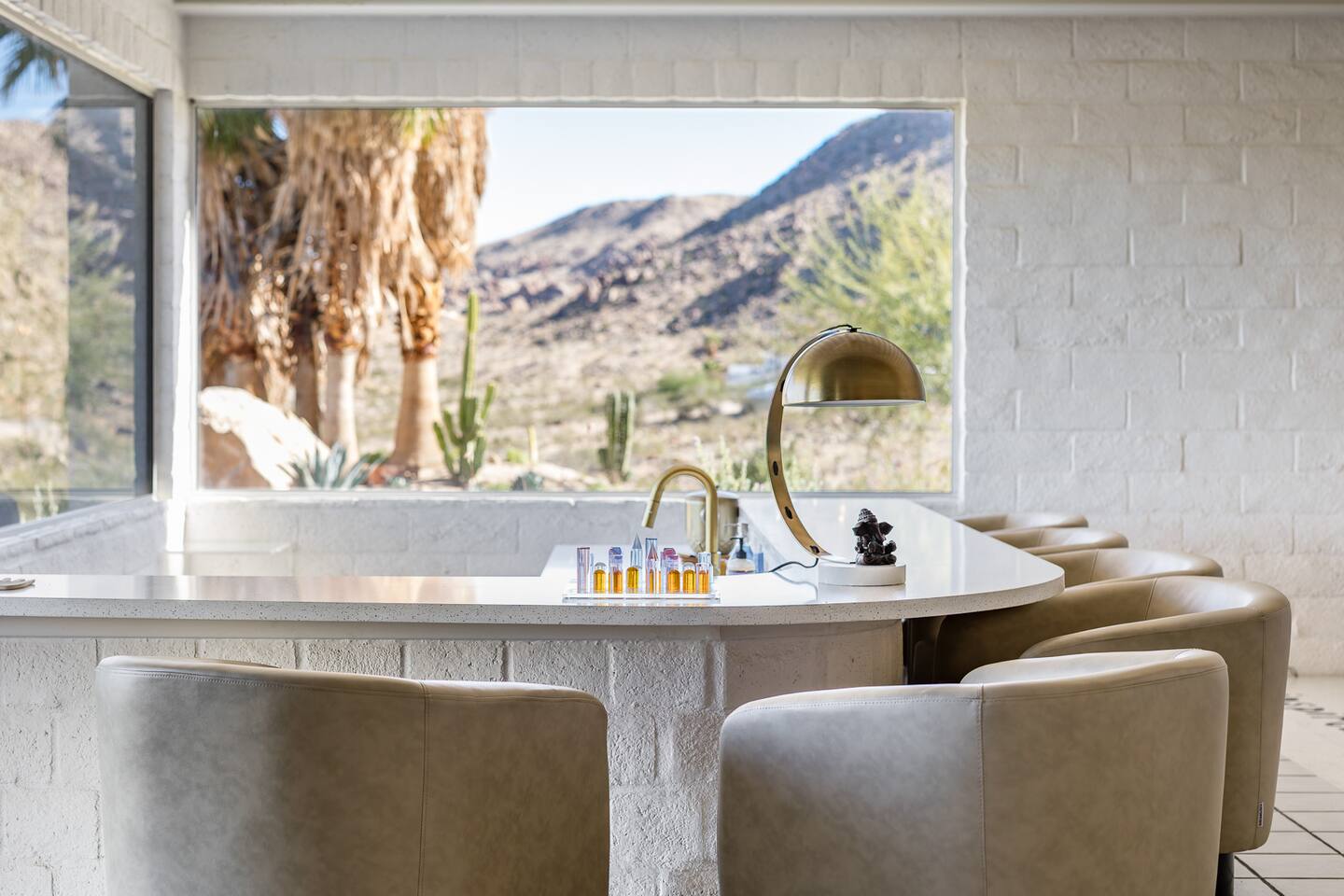 Nestled against the rocks in 29 Palms, Zainaland is a stunning, 3 bedroom, 3.5 bathroom unique estate. Live outdoors with sweeping views, a hot tub, wood burning firepit and outdoor dining space. Inside, relive Joshua Tree in the 70's with this captivating home full of original details and eclectic decor. Cozy up to the bar in the gigantic living room and toast to the desert in this wildly exotic, but elegant home.