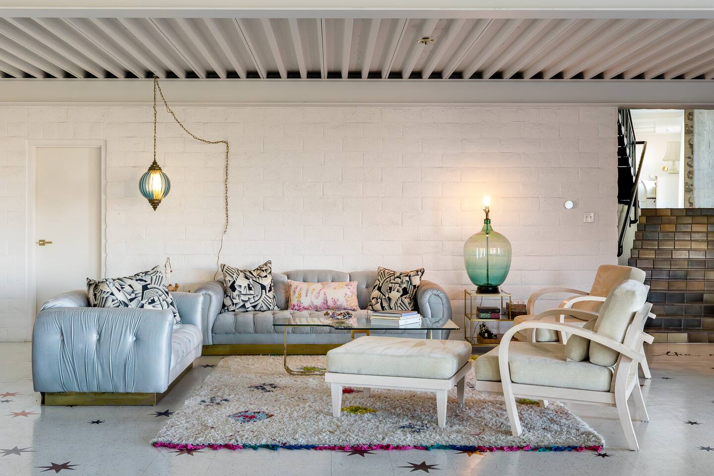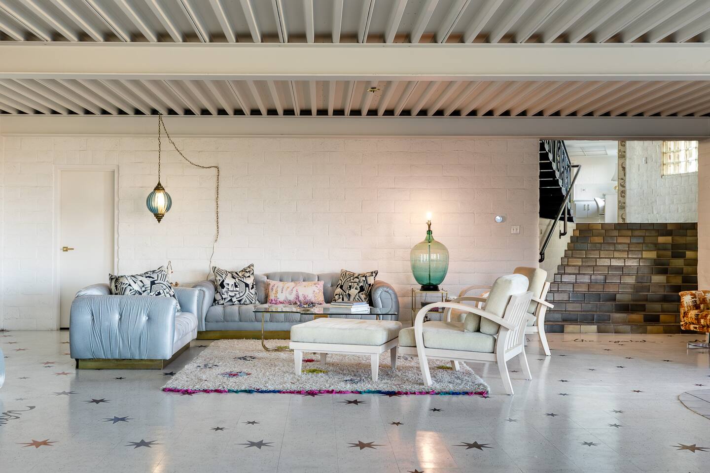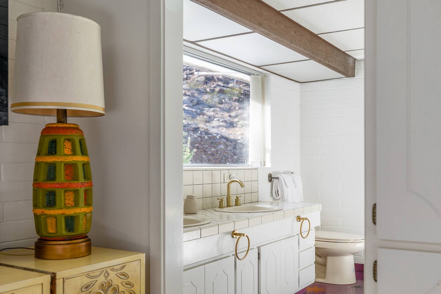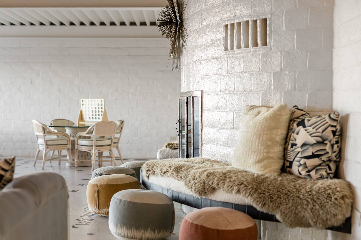 Nestled against the rocks in 29 Palms, Zainaland is a stunning, 3 bedroom, 3.5 bathroom unique estate. Live outdoors with sweeping views, a hot tub, wood burning firepit and outdoor dining space. Inside, relive Joshua Tree in the 70's with this captivating home full of original details and eclectic decor. Cozy up to the bar in the gigantic living room and toast to the desert in this wildly exotic, but elegant home.