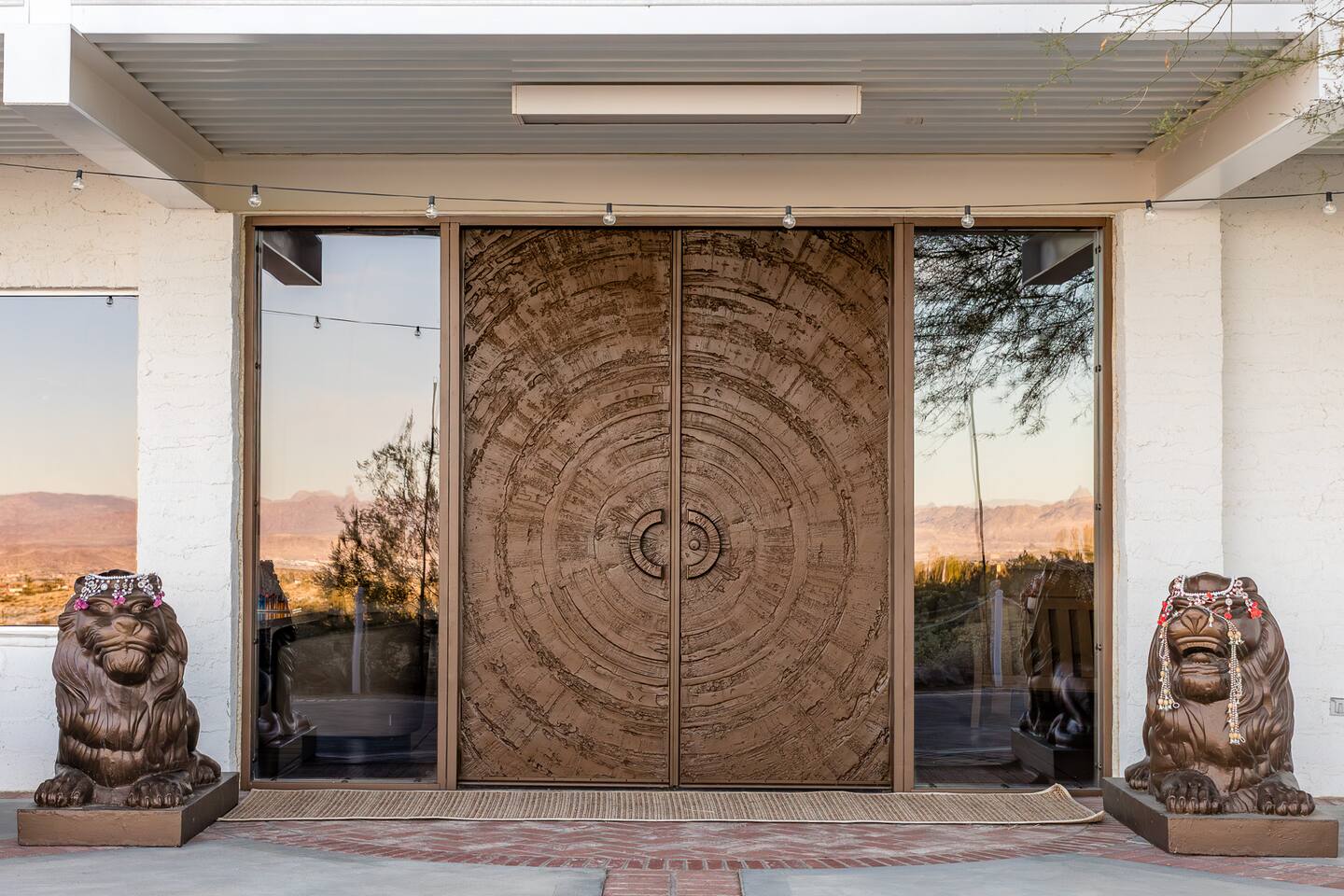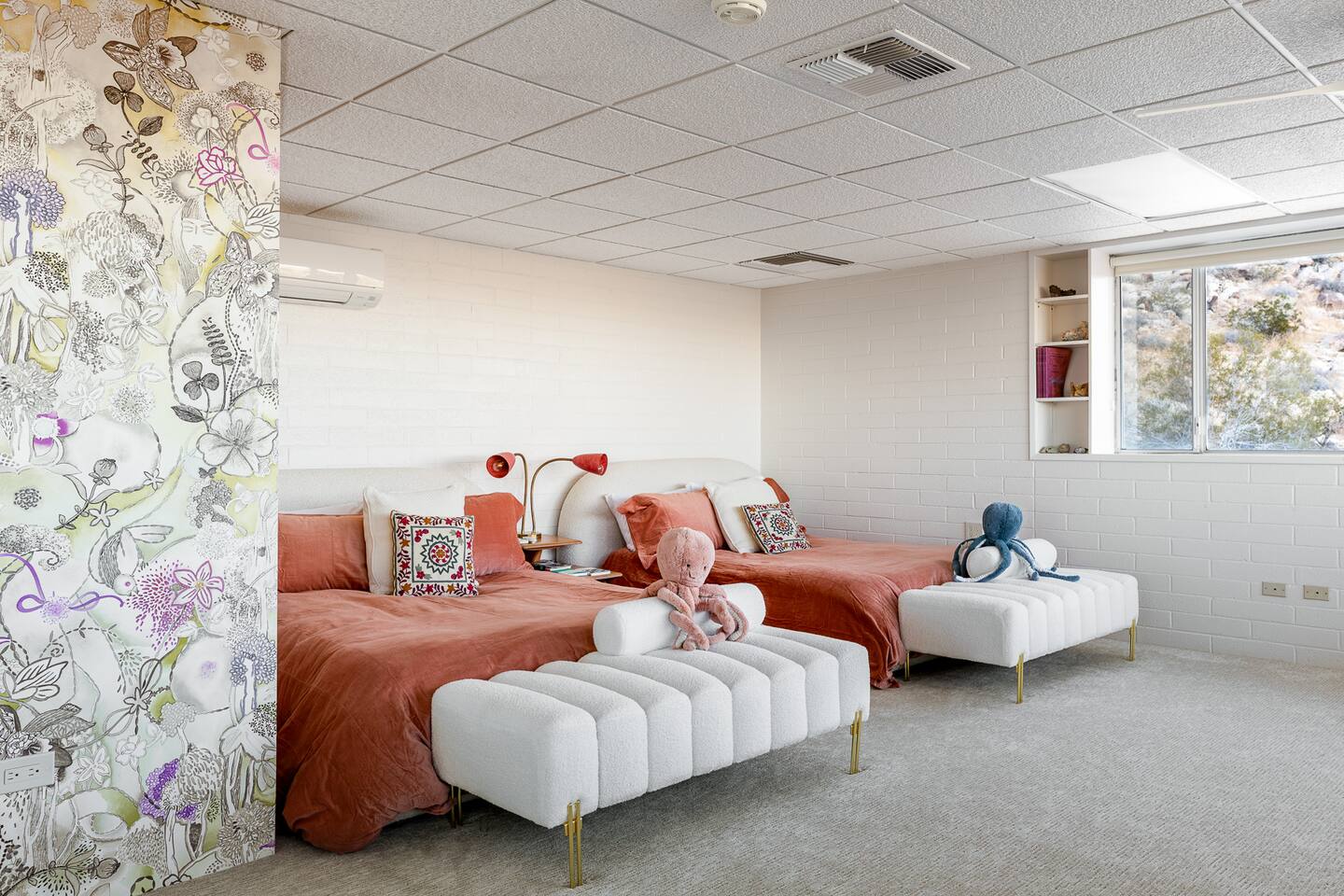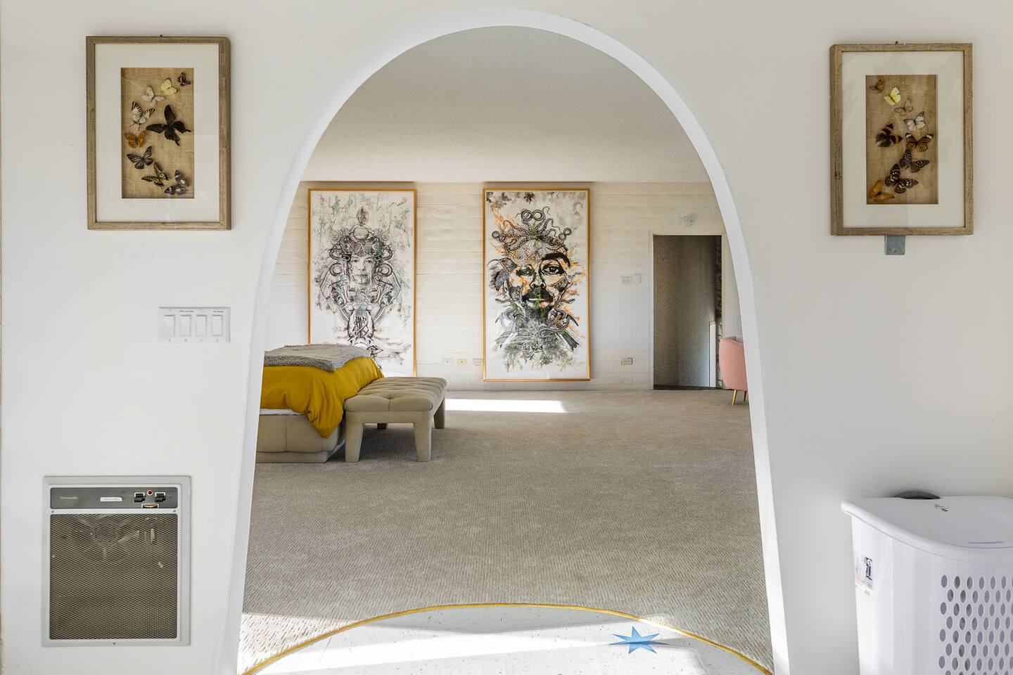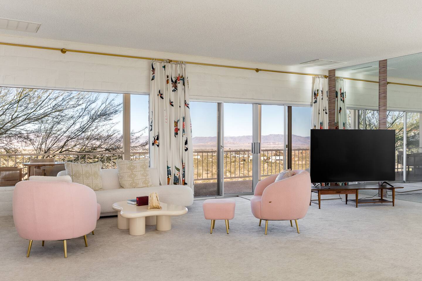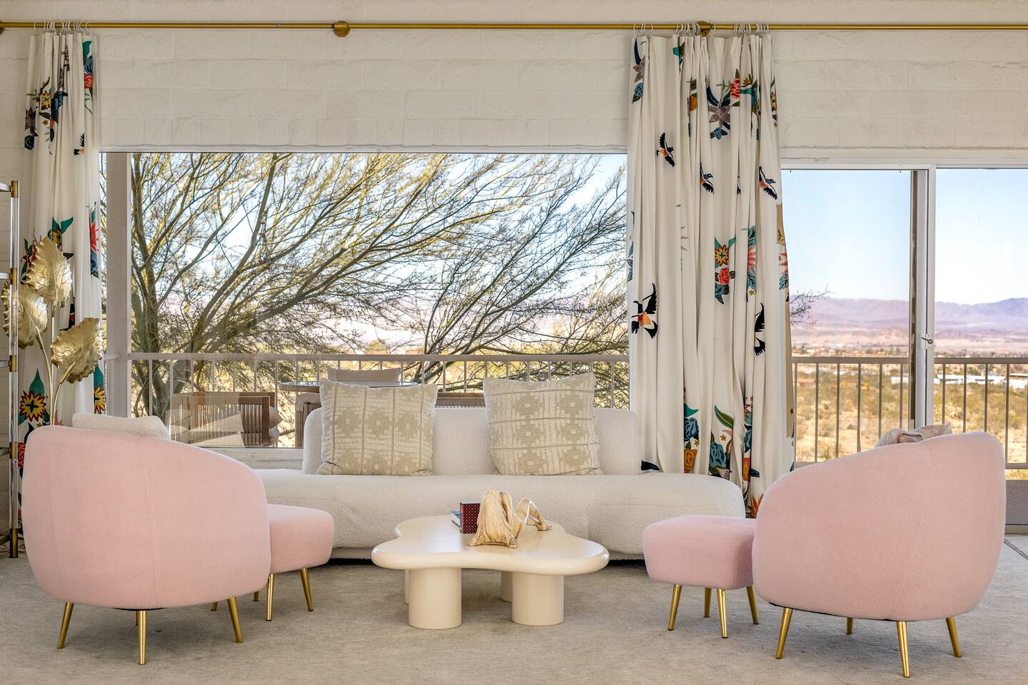 Nestled against the rocks in 29 Palms, Zainaland is a stunning, 3 bedroom, 3.5 bathroom unique estate. Live outdoors with sweeping views, a hot tub, wood burning firepit and outdoor dining space. Inside, relive Joshua Tree in the 70's with this captivating home full of original details and eclectic decor. Cozy up to the bar in the gigantic living room and toast to the desert in this wildly exotic, but elegant home.
