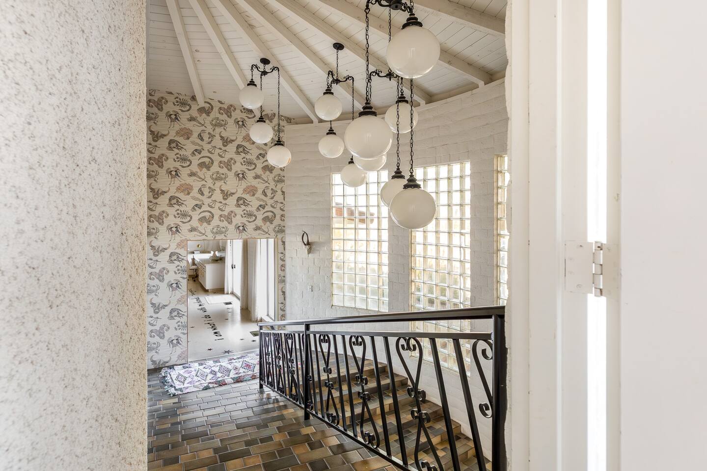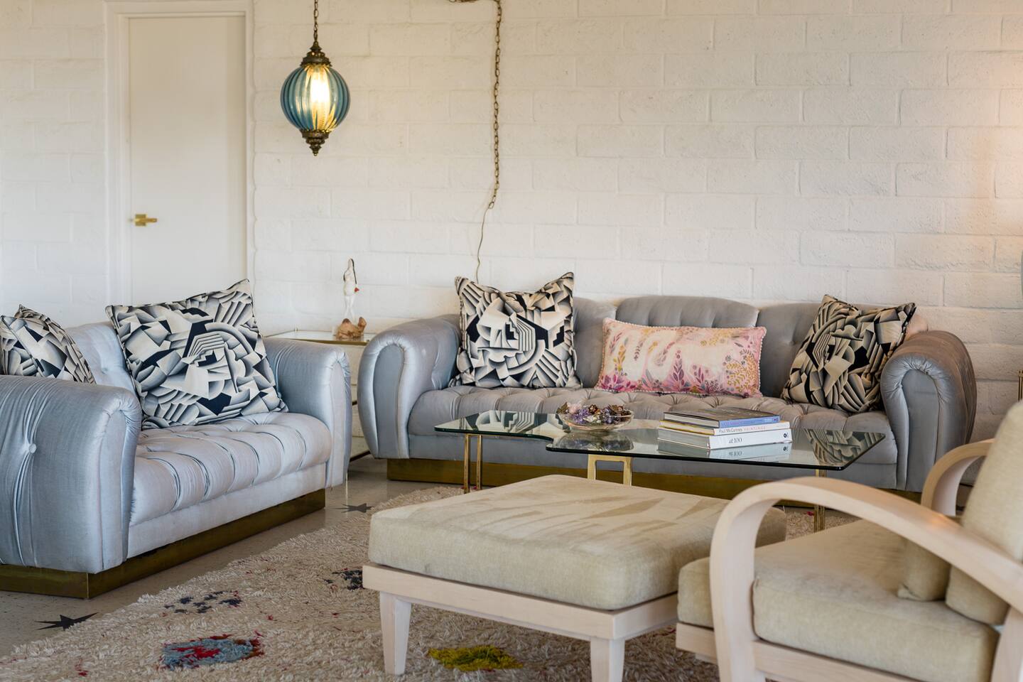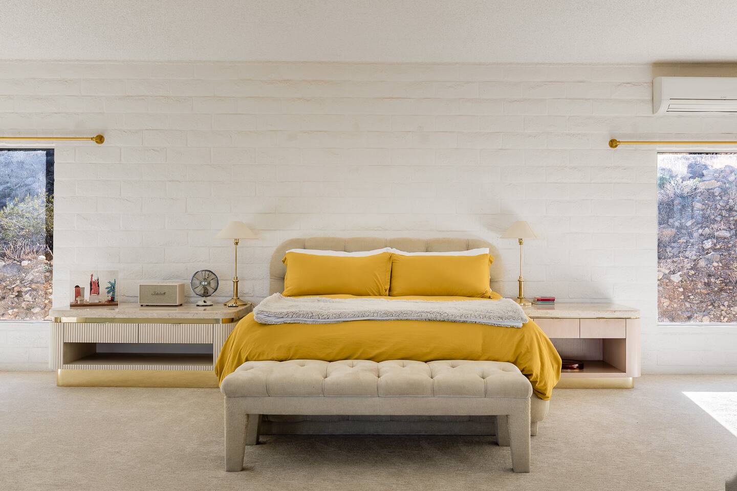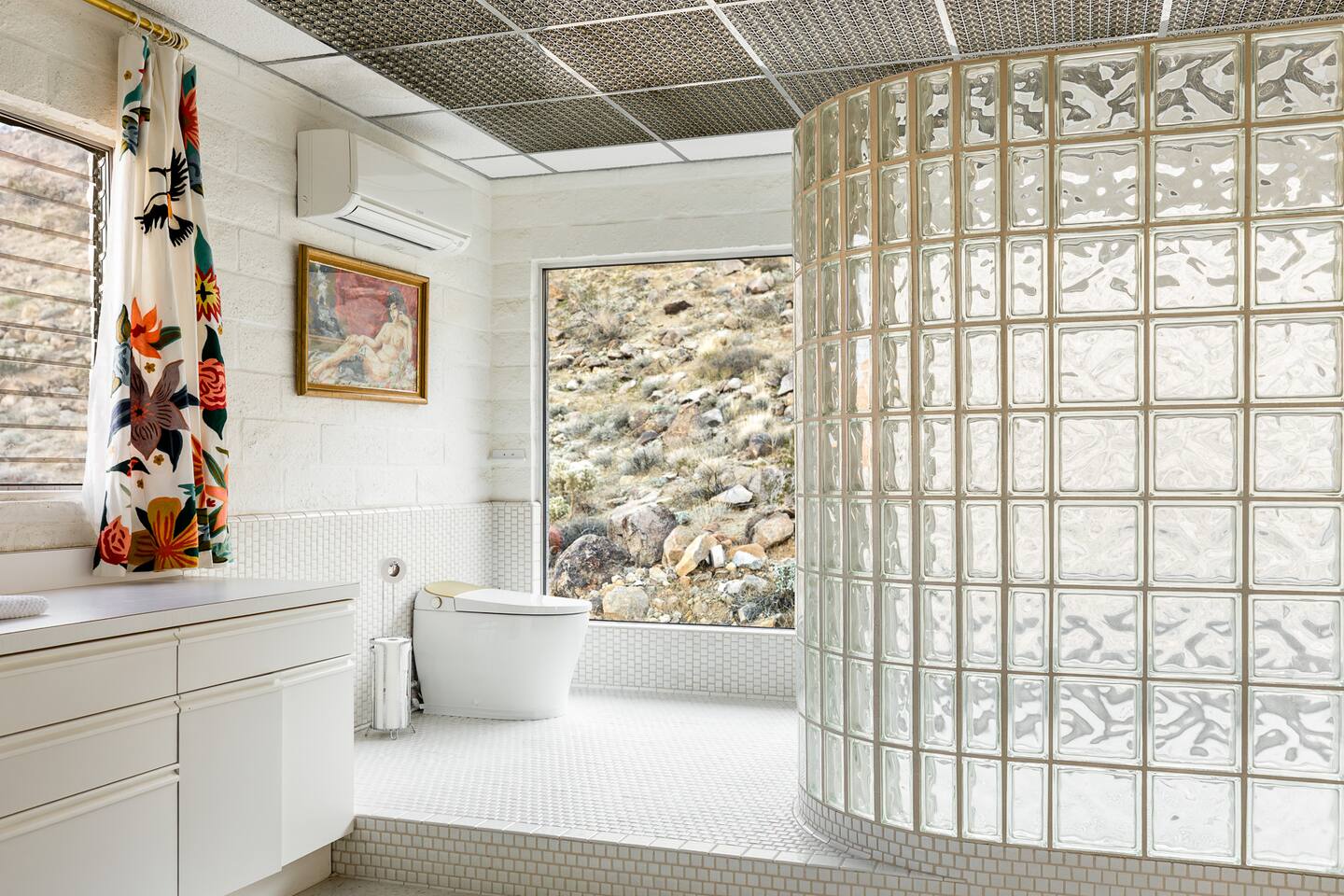Nestled against the rocks in 29 Palms, Zainaland is a stunning, 3 bedroom, 3.5 bathroom unique estate. Live outdoors with sweeping views, a hot tub, wood burning firepit and outdoor dining space. Inside, relive Joshua Tree in the 70's with this captivating home full of original details and eclectic decor. Cozy up to the bar in the gigantic living room and toast to the desert in this wildly exotic, but elegant home.